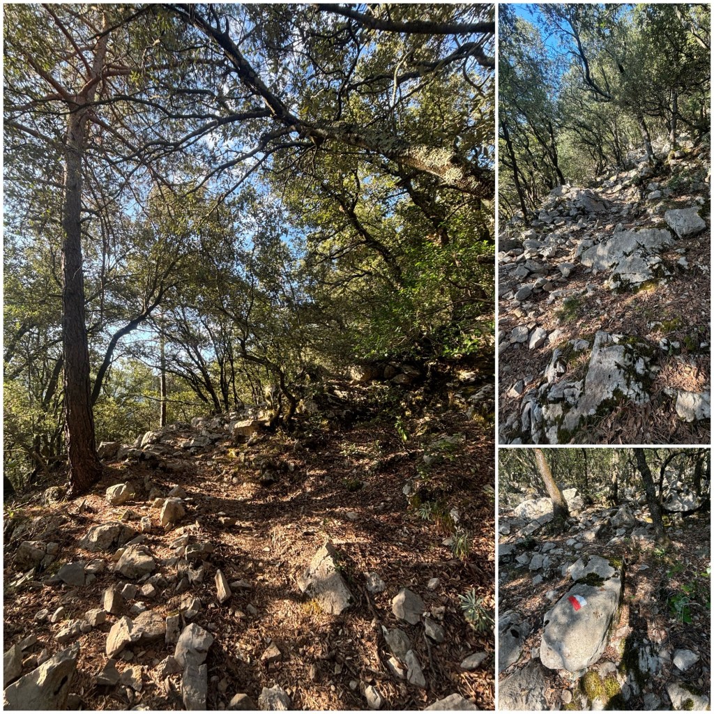 Tras unos kilómetros de pista, el GR continúa por senderos algo más complicados, con constantes subidas y bajadas. A medida que avanzo aparecen algunas especies de árboles, mayoritariamente pinos y alcornoques. Continúo y poco después me cruzo con el primer senderista que, aparentemente, está haciendo el GR11. Viene en dirección contraria, así que le quedan poco menos de 9 kilómetros para acabar su aventura, ¡Qué lejos veo el final de la mía!