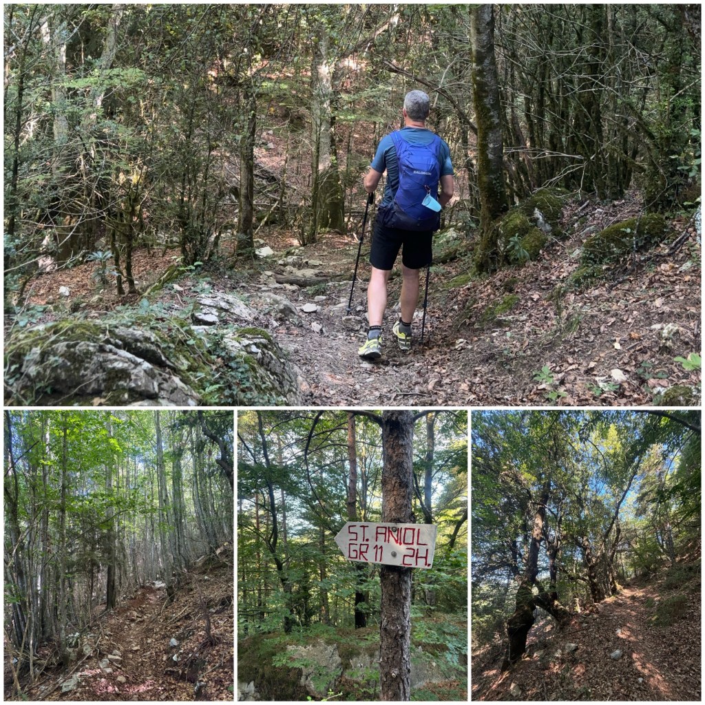 Por una pista forestal rodeada de altísimos pinos se sigue ahora unos cientos de metros y se llega a un nuevo alto, que ya es el definitivo, el Coll de Principi, de 1.103 metros. Desde el camping hasta aquí han sido 945 metros de desnivel en unos 10 kilómetros, y no solo es el primer gran ascenso del GR11, sino que también es la primera vez que se superan los 1.000 metros de altitud.