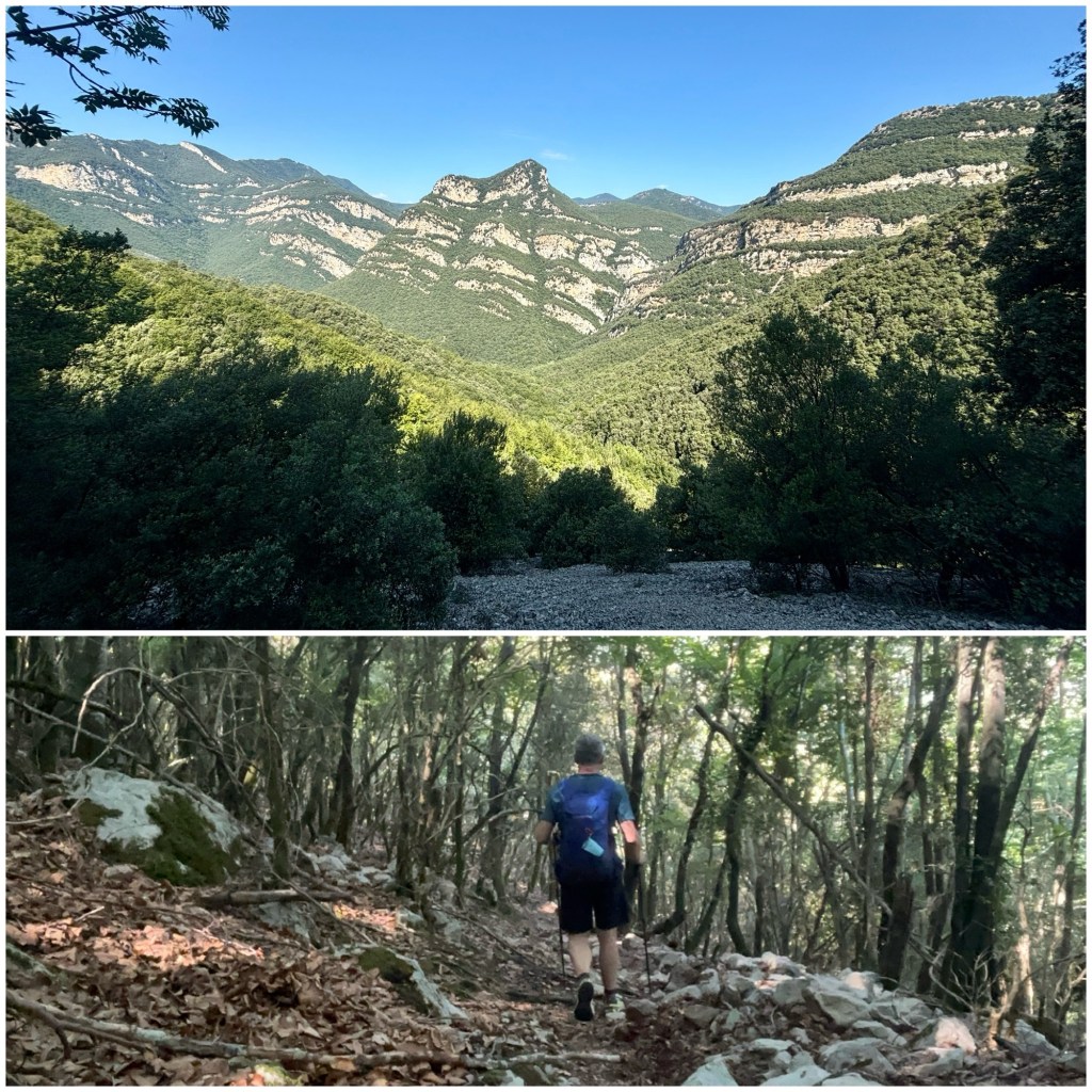 El sendero desciende durante varios kilómetros, siempre a través de bosques preciosos y rodeado de montañas con unas formas muy características, esas franjas de roca vertical desnuda que se alternan con otras con menos pendiente cubiertas de vegetación. Aunque como casi todo el rato camino por dentro del bosque, la mayor parte del tiempo no se ven.