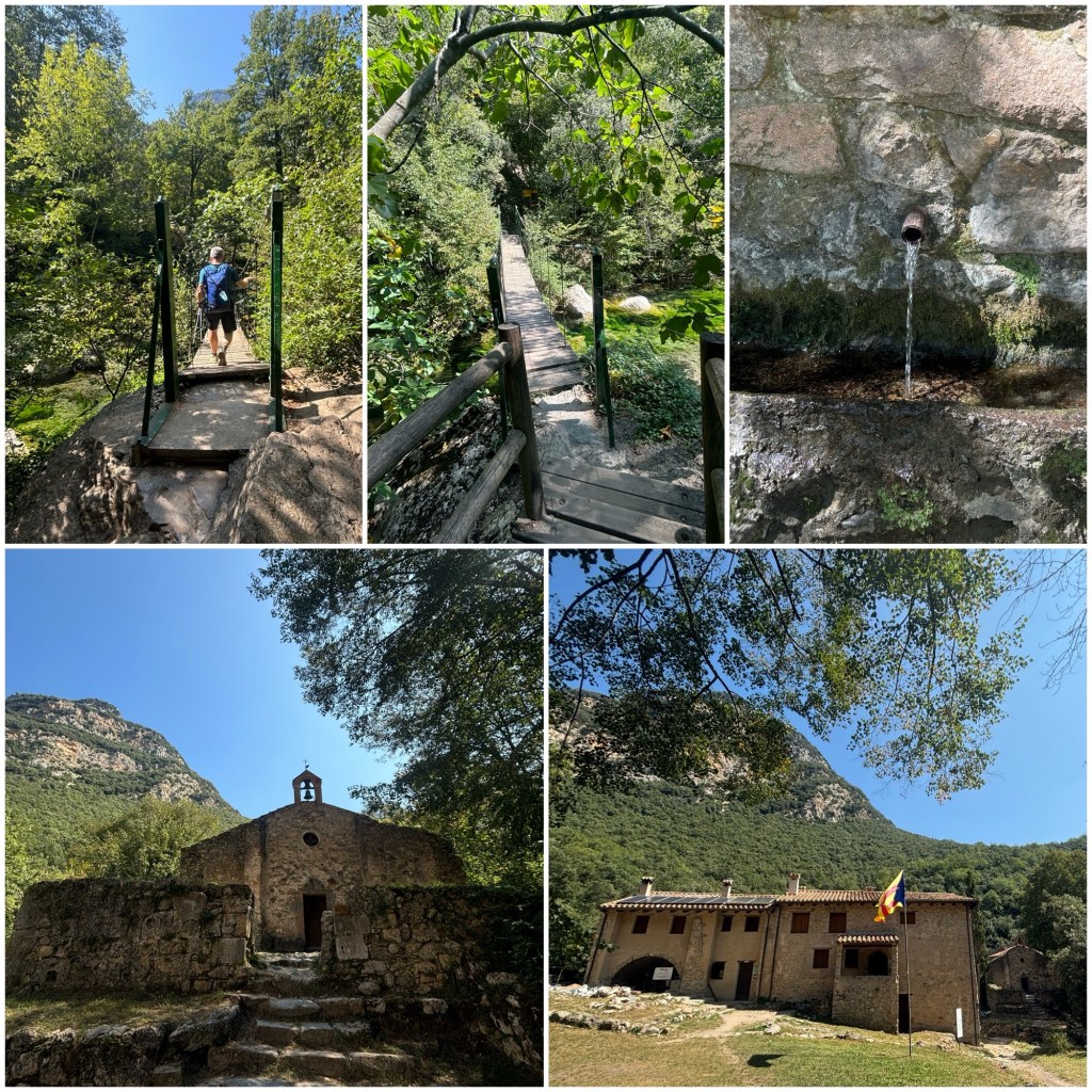 El largo descenso, que ha sido muy bonito, termina en un riachuelo que hay que atravesar por unas piedras, para poco después volver a cruzar otro río, esta a vez por un puente colgante. Al otro lado se llega a Sant Aniol d’Aguja, ermita que fue parte de un antiguo monasterio benedictino fundado en este lugar en el siglo IX. La antigua rectoría se está reconvirtiendo en refugio y, cuando esté terminado, estará en un lugar espectacular. También hay una fuente, en la que aprovecho para comerme otro plátano y más galletas.