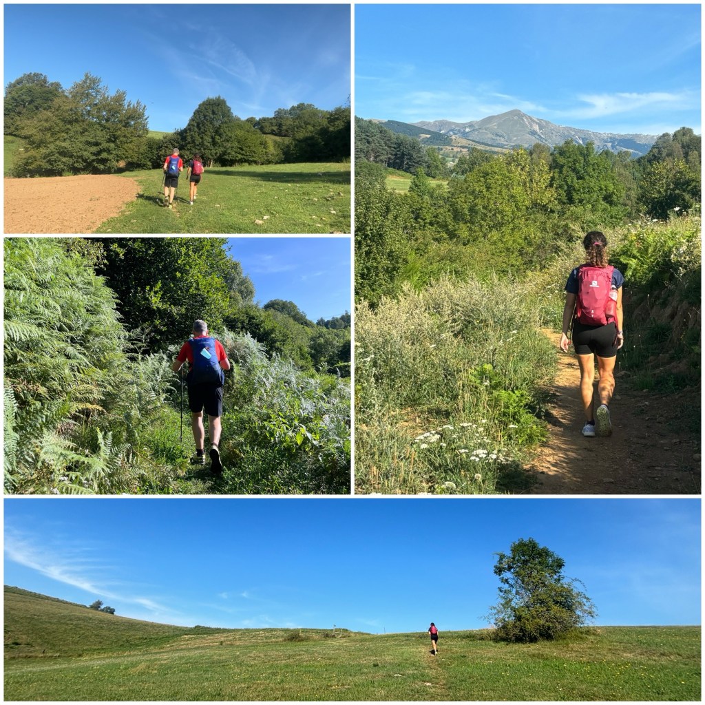 Seguimos subiendo por pistas, aunque a medida que ascendemos predominan los tramos en los que se avanza directamente a través de los pastos. Se confirma que el entorno ha cambiado completamente respecto a los días anteriores. Además, hasta ayer la altitud máxima por la que había pasado era 1.100 metros, mientras que hoy vamos a llegar a casi 1.900, y eso se ve claramente en el tipo de paisaje predominante.