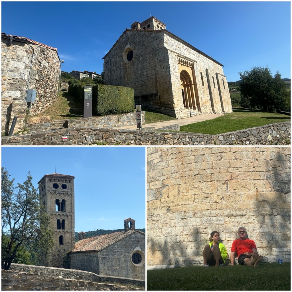 Desde el collado se desciende ligeramente hasta cruzar el río Ritort y luego se recupera la altura perdida en una fuerte cuesta que nos deja en Molló. En esta población no encontramos ningún bar abierto, pero en una carnicería nos hacen unos bocadillos y en otra tienda compramos un par de latas de Aquarius, y nos lo tomamos todo tumbados en el césped que rodea la bonita iglesia románica de Santa Cecília de Molló. Un descanso que nos ha sentado de maravilla.