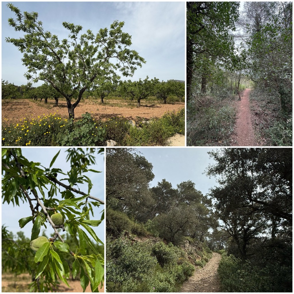 Cuando llevo andados unos seis kilómetros, este entorno forestal da paso a una zona más llana y agrícola. Hay viñedos, almendros y plantaciones de trigo. Desde aquí, tres kilómetros más por una pista asfaltada me llevan al Pla de Santa María, pequeña población de origen medieval en la que paro a tomar un café.