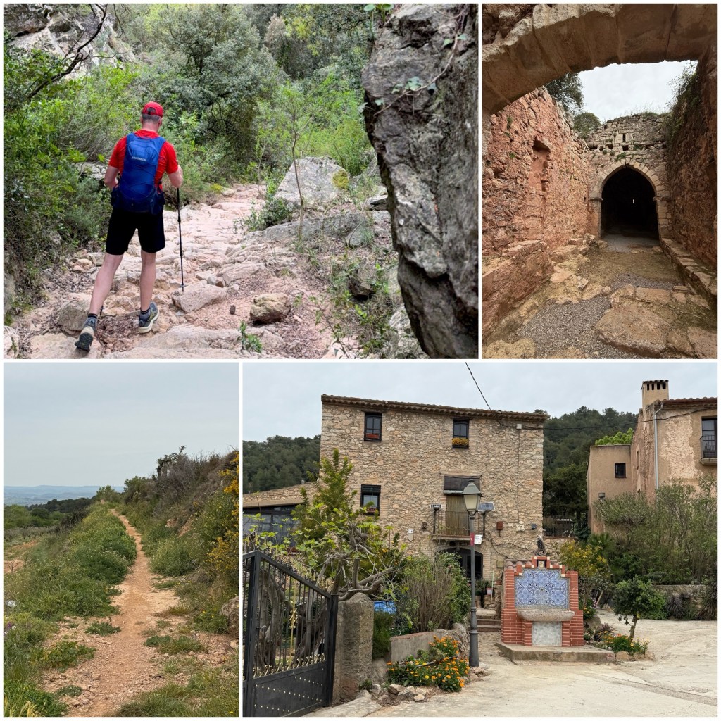 Una vez superados los dos collados se inician varios kilómetros de descenso por un sendero. Durante la bajada se pasa por las ruinas de la iglesia de San Salvador, parte de lo poco que queda en pie del antiguo pueblo de Prenafeta, abandonado en el siglo XVIII por su difícil acceso con carros y caballerías, debido a su posición en la ladera de la montaña. Sigo descendiendo y, poco después, llego al actual núcleo de Prenafeta, levantado en una ubicación más amable en el fondo del valle.