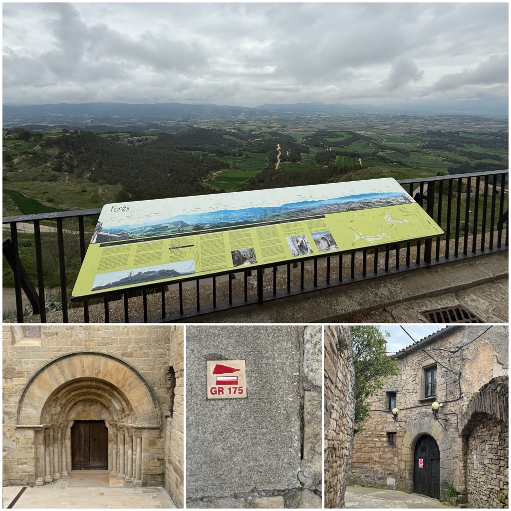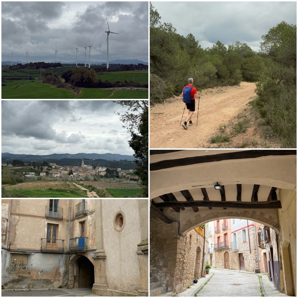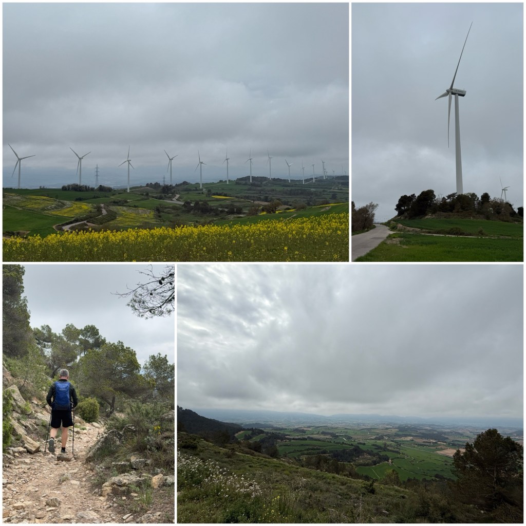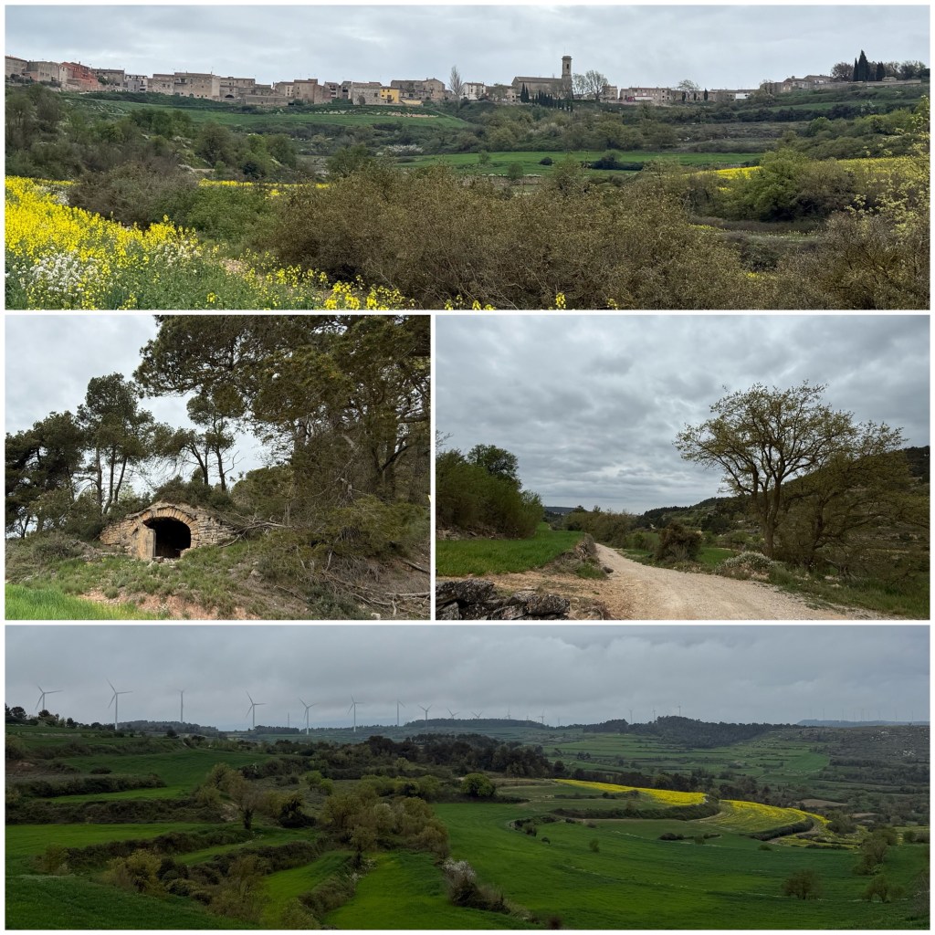 Desde el hotel en el que he dormido, retrocedo un kilómetro hasta enlazar con el GR en el punto donde lo dejé ayer, y siguiéndolo entro en Rocallaura, pequeño núcleo situado en lo alto de un promontorio. Lo atravieso y continúo por una pista que va remontando suavemente por la Sierra del Tallat, la misma que crucé ayer para llegar a Vallbona de les Monges, pero atravesándola esta vez en sentido contario y más al norte. El entorno son bosques de robles y pinos, y plantaciones de colza o cereal. Paso por Belltall, otro núcleo situado en un alto, y continúo la travesía, acercándome a una gran fila de aerogeneradores en la cresta de la montaña.