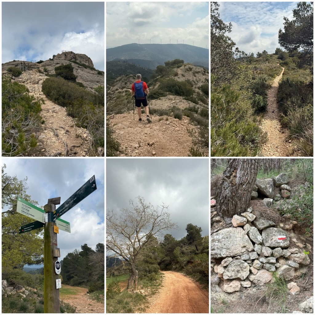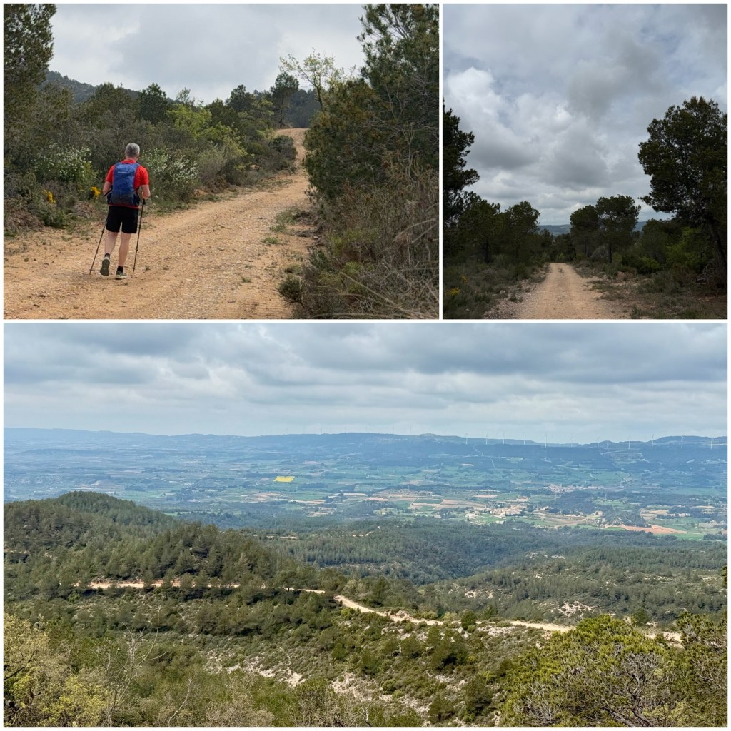El falso llano ha durado poco, porque al salir de Montbrió empiezo un largo ascenso por una pista forestal, mayoritariamente entre pinares, para remontar la sierra de Comaverd, que como todas las que recorro en esta ruta pertenece a la Cordillera Prelitoral Catalana. A medida que subo, a mis espaldas voy dejando la Conca de Barberà y, al fondo, la sierra del Tallat que he atravesado hace unas horas, con las filas de aerogeneradores en la cima.