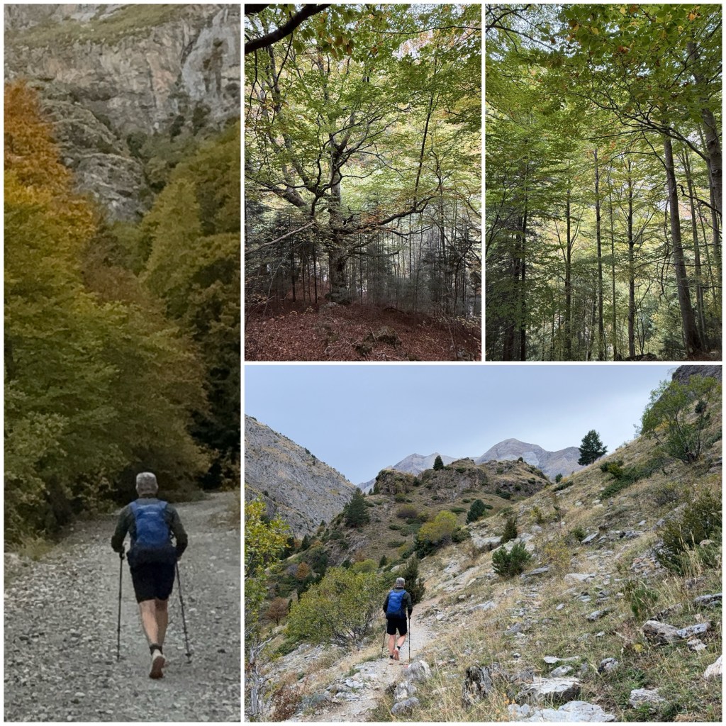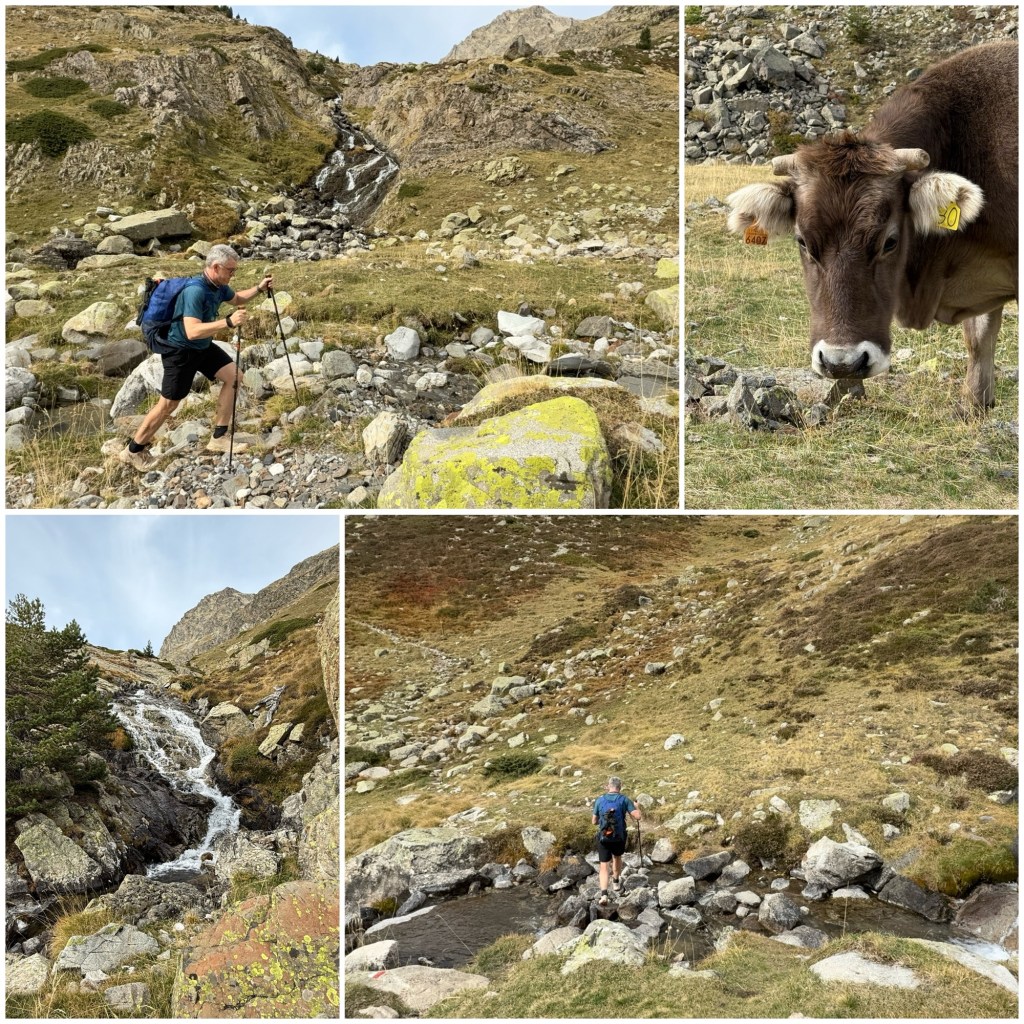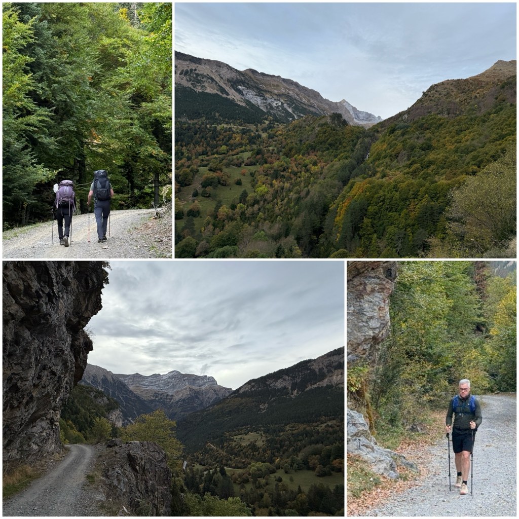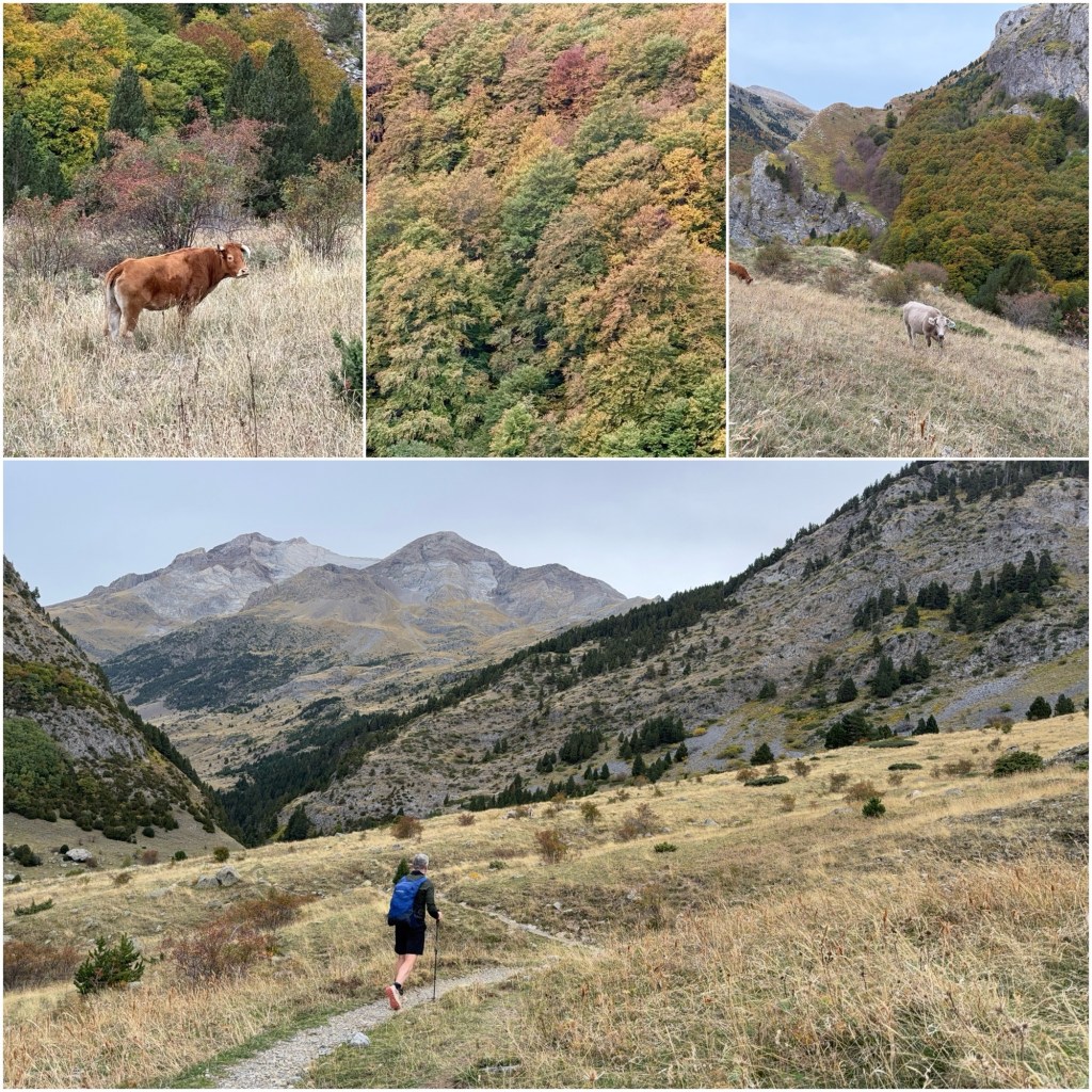 Los árboles muestran los colores del otoño, aunque a medida que subo van desapareciendo y predominan las praderas de alta montaña, donde pastan vacas. Frente a mi tengo una vista espléndida del Macizo del Vignemale, otro de los principales grupos de tresmiles de los Pirineos.