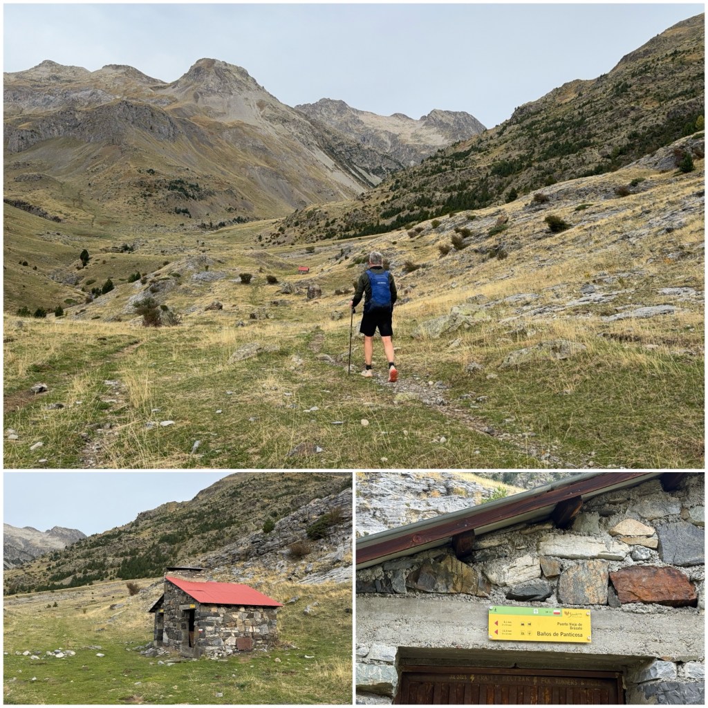 El camino continúa siempre en ascenso. Más adelante paso por una cabaña de pastores que hace también de refugio libre y, junto a ella, paro un rato a descansar y comer algo. Estando ahí ha llegado un australiano que venía detrás de mí desde Bujaruelo y hablamos un rato. Empezó el GR11 en el Cap de Creus hace tres semanas y media, pero lo sorprendente es que es su primera experiencia de senderismo, nunca había hecho nada parecido. Me comenta que al llegar al final no sabe qué hacer y que se está planteando seguir hacia Santiago, así que le hablo del Camino del Norte, ya que enlaza directamente en Irún con la transpirenaica.