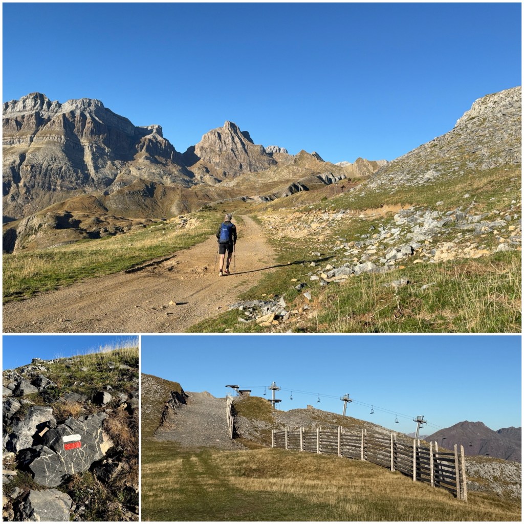 La etapa empieza remontando por fuertes rampas de hierba de lo que habitualmente son pistas de esquí. Entre telesillas, telesquís y cañones de nieve, voy alejándome del núcleo de Candanchú. Desde lo alto de un risco, un sarrio solitario me observa.