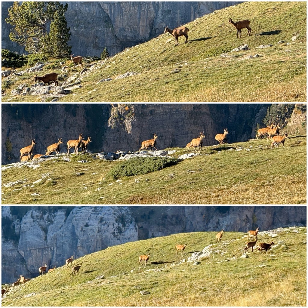 Sigo caminando y cuando miro a mi izquierda veo un gran grupo de sarrios que casi paso por alto. Durante un rato contemplo como corretean arriba y abajo, hasta que cruzan la pista cincuenta metros por delante de mí y suben al risco de mi derecha.