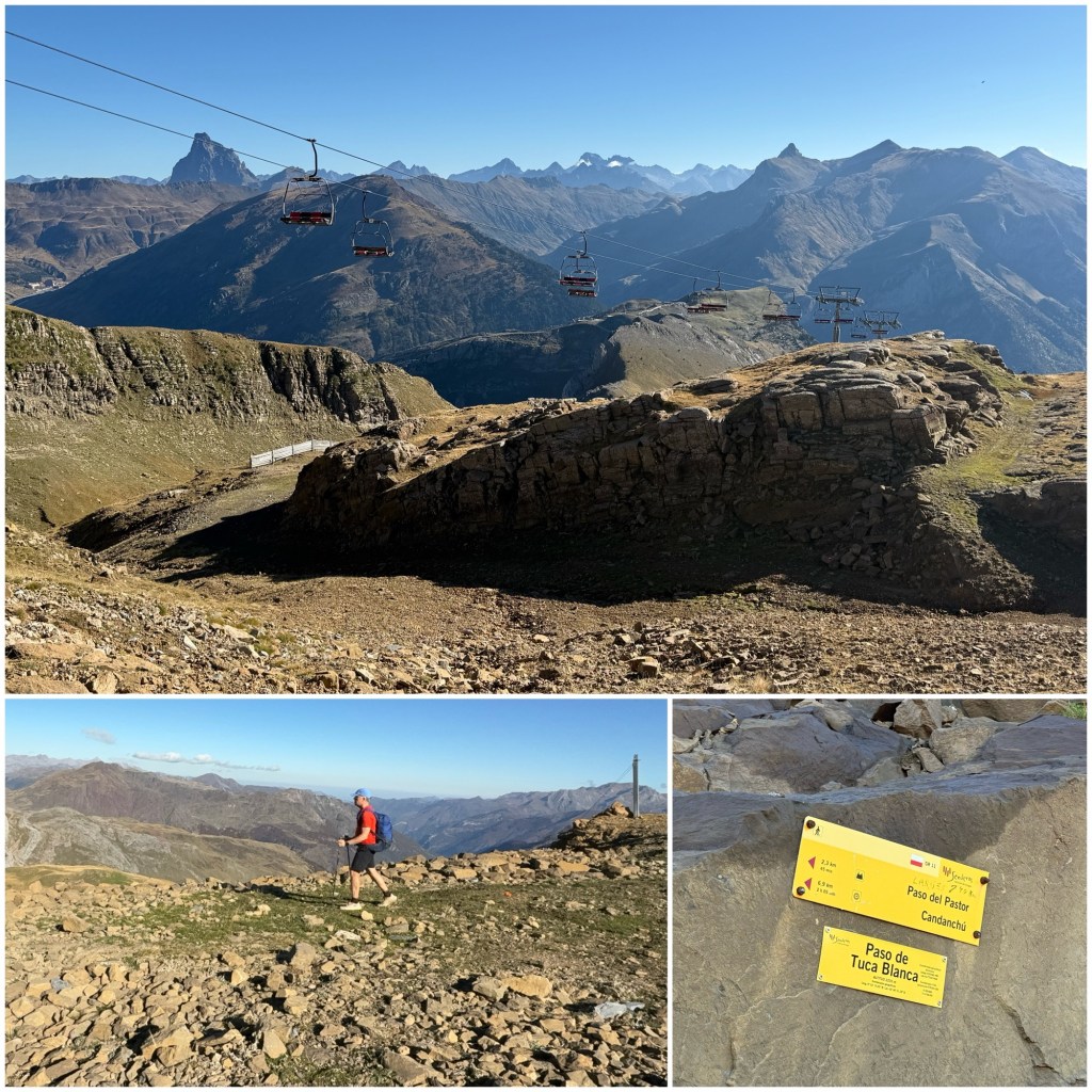 La bajada termina rápido, y de nuevo empiezo a subir. Mientras lo hago, tengo visible a mis espaldas el Valle de la Canal Roya, por donde descendí ayer por la tarde y por donde el proyecto de unir este complejo invernal con el de Formigal pretende hacer pasar un telecabina. Una última rampa y alcanzo finalmente el punto más elevado de la estación, el Paso de Tuca Blanca, un collado de 2.243 metros de altitud.