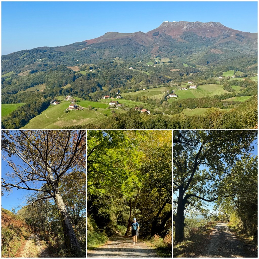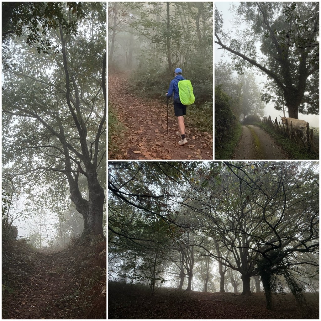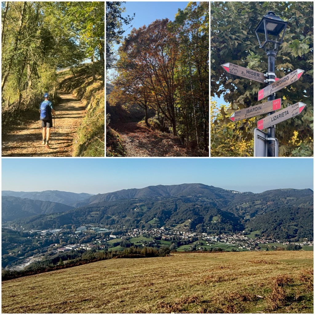 Dejo atrás Elizondo envuelto en la niebla, que luego se convierte en una lluvia muy ligera. Primero por una pista asfaltada y luego por un sendero que me lleva entre grandes robles y castaños empiezo a remontar.