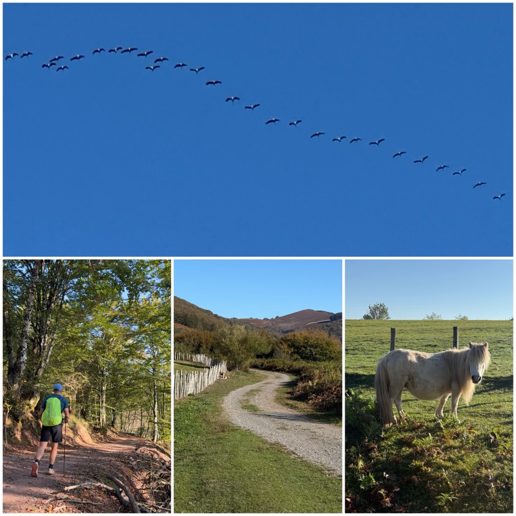 Sigo ahora por una pista forestal. A mi izquierda tengo algunas palomeras, los puestos para la caza de la torcal, aunque al contrario que en la jornada de ayer no paso demasiado cerca. Estos collados de baja altitud del extremo de los Pirineos son ideales para las aves que en esta época del año realizan su migración anual hacia el sur de la península y África. Aunque cuestan de identificar en una foto tomada con un móvil, si ningún experto me contradice creo que se trata de una bandada de grullas en su viaje desde el norte de Europa hacia tierras más cálidas en las que pasar el invierno.