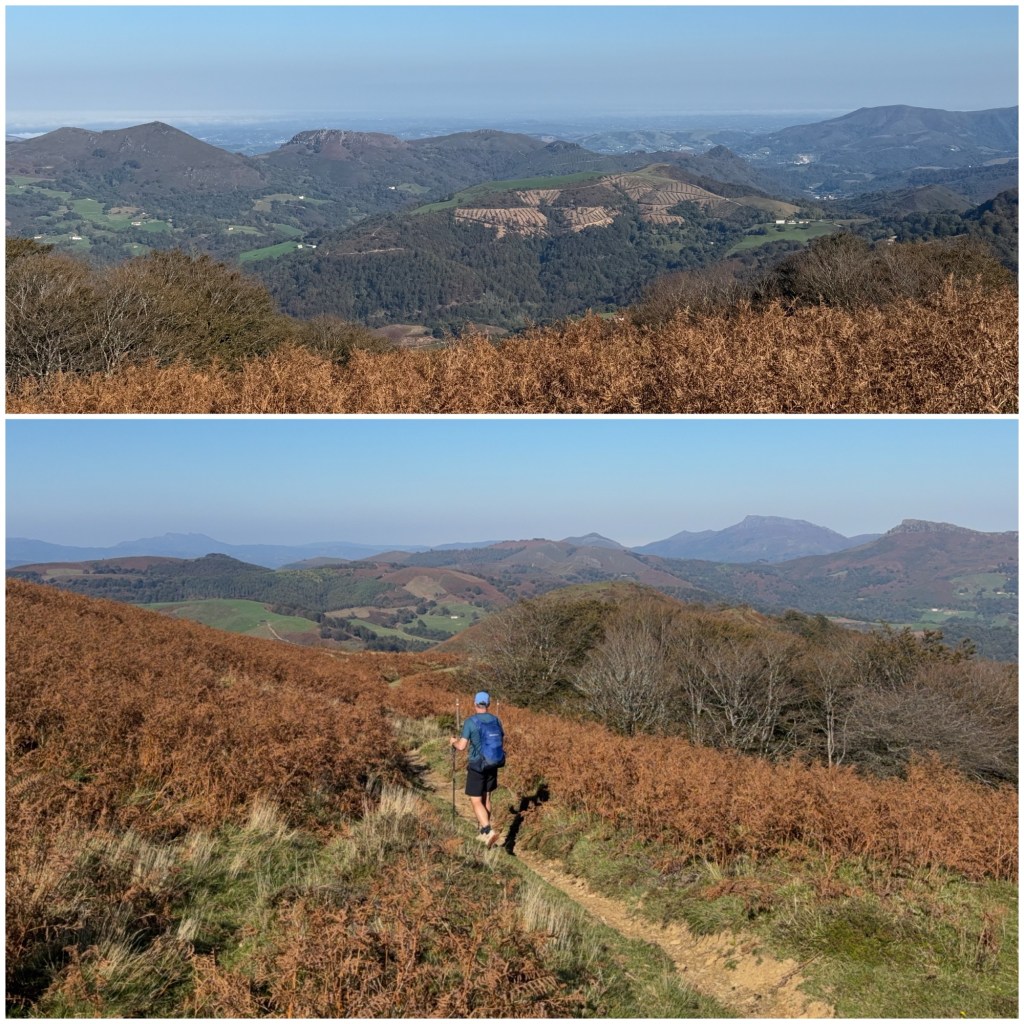 El descenso me lleva hasta el Collado de Eskisaroi, donde cruzo una carretera. Desde aquí prosigo subiendo y bajando ligeramente por montañas que cada vez tienen menos altitud a medida que me acerco al final de la cordillera.