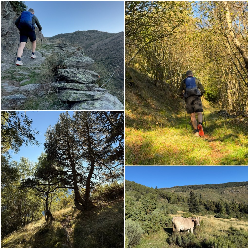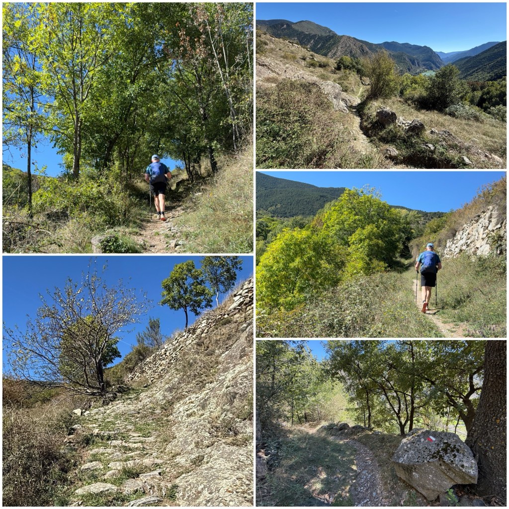 Si en Dorve, al otro lado del valle, gran parte de las casas parecían abandonadas, en Jou es totalmente diferente y casi todas están restauradas. Lo cruzo y continúo, ahora por un par de kilómetros de carretera prácticamente planos. Cuando dejo el asfalto tomo un sendero a través de un bosque de pino negro. El camino avanza por la ladera de la montaña, sin apenas pendiente, y creo que es la primera vez en toda la etapa que no estoy subiendo o bajando.