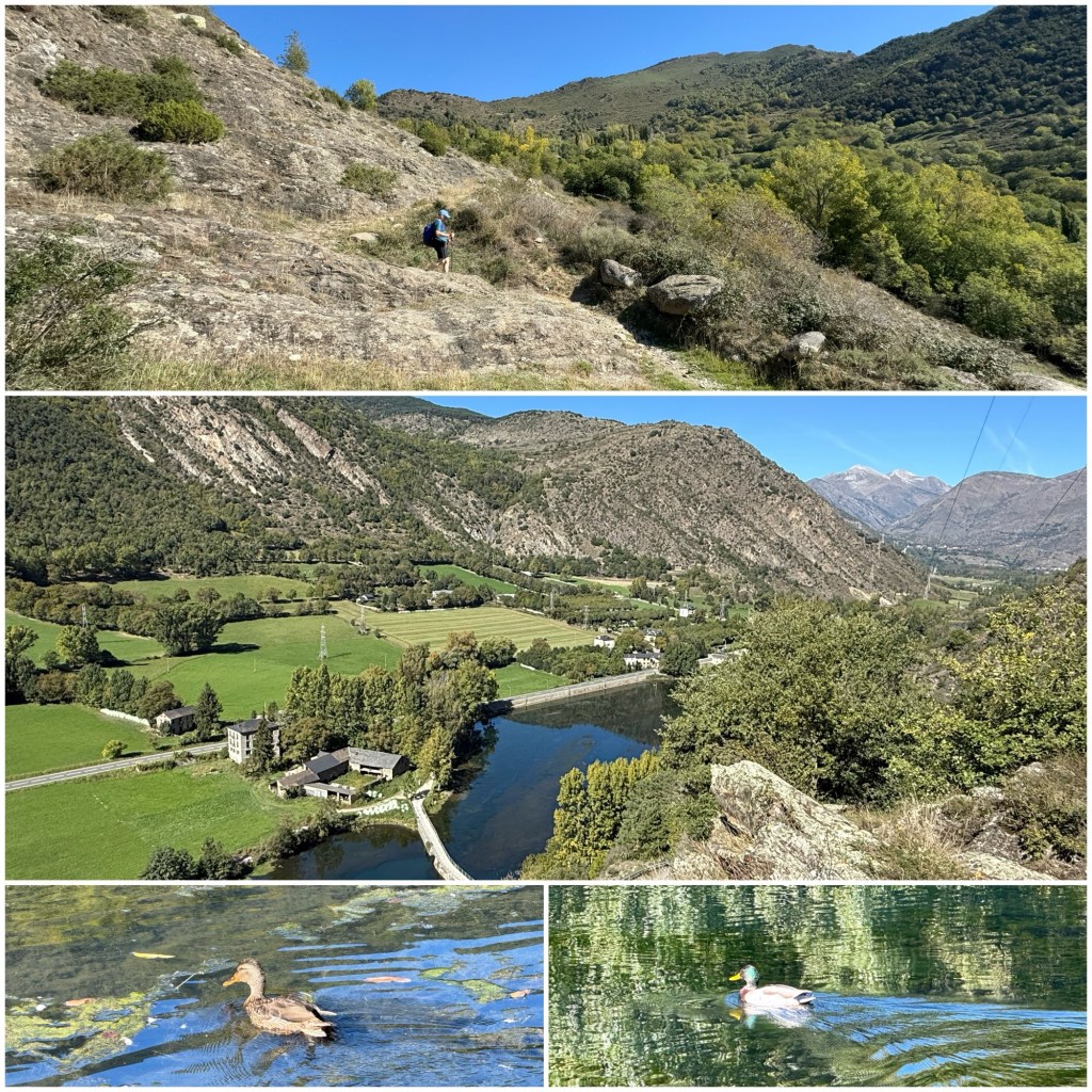 Continúo descendiendo hasta que finalmente llego a orillas del río Noguera Pallaresa, embalsado aquí en el pequeño pantano de La Torrassa, donde nadan algunos patos. Lo cruzo por un puente y entro en la Guingueta d’Àneu, donde paro a comer un bocadillo.