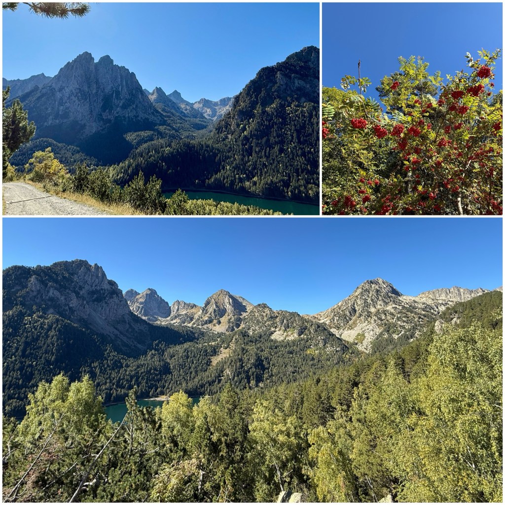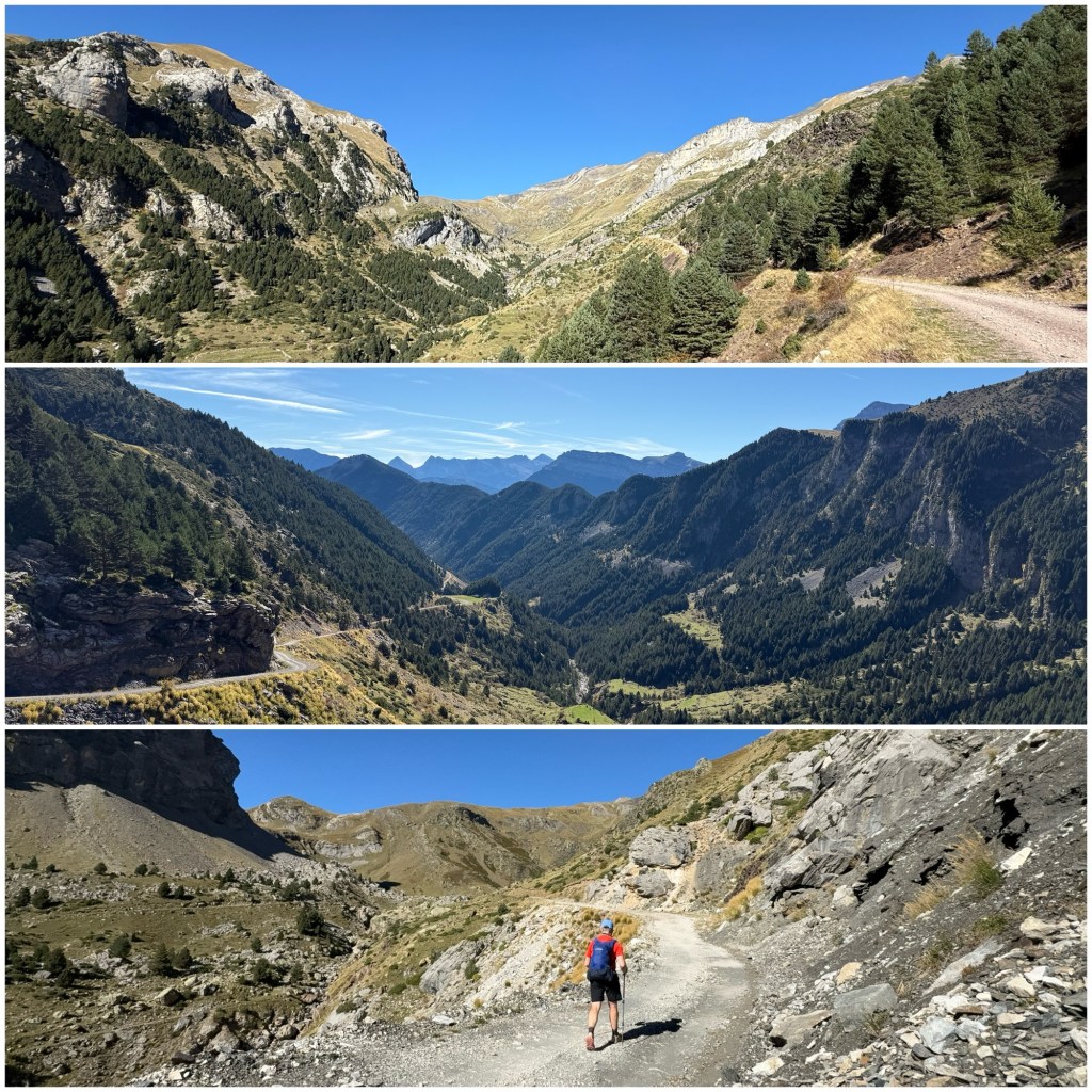 Me como una barrita energética y unos frutos secos, y para abajo. Al fondo del valle veo la carretera N-230, la que comunica con el Valle de Aran por el túnel de Viella, y muy cerca de la boca sur del túnel, el Refugio de Conangles, al que me dirijo. Y frente a mí tengo los primeros macizos del Pirineo Aragonés. La vista es fabulosa.