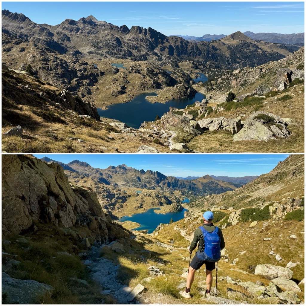 Inicio el descenso, hasta que en un punto me quedo parado del grandioso espectáculo que tengo a mis pies. Es una vista fabulosa de los lagos a los que me he de dirigir a continuación, formando una estampa perfecta.
