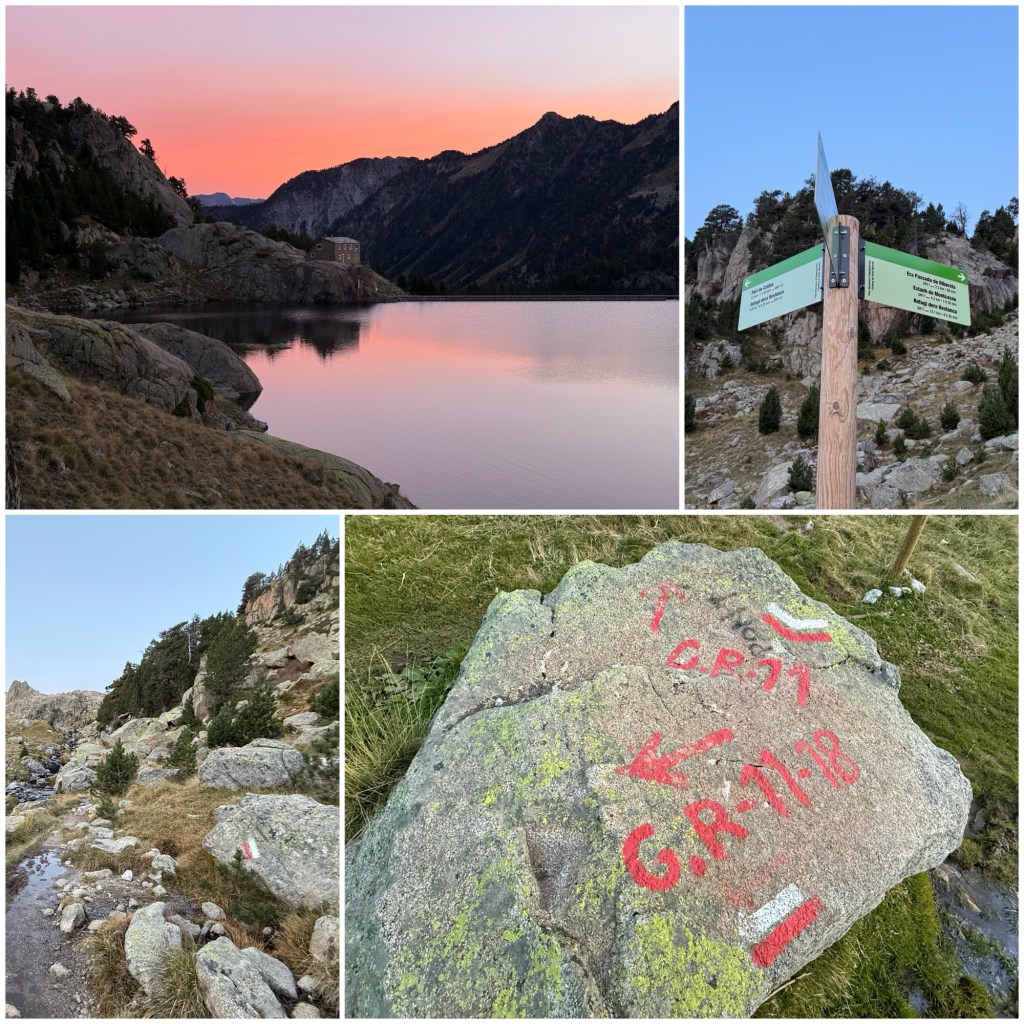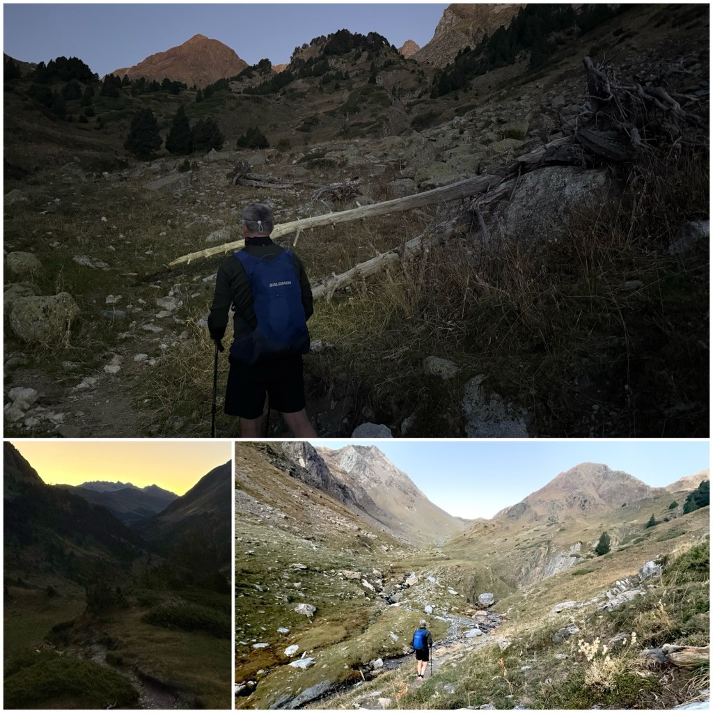Salgo temprano, cuando aún está amaneciendo, y enseguida encuentro un cruce importante. Entre Colomers y el refugio de la Restanca, al que me dirijo, el GR11 “tradicional” da un gran rodeo alejándose de la zona central, y más agreste, del parque nacional. Pero existe otra variante, la GR11.18, más directa, cruzando zonas de alta montaña, y que hoy día es la mayoritaria. Decido seguir esta y pronto inicio un ascenso por un sendero paralelo a un torrente. El terreno es complicado, con grandes bloques de piedra que he de ir esquivando.