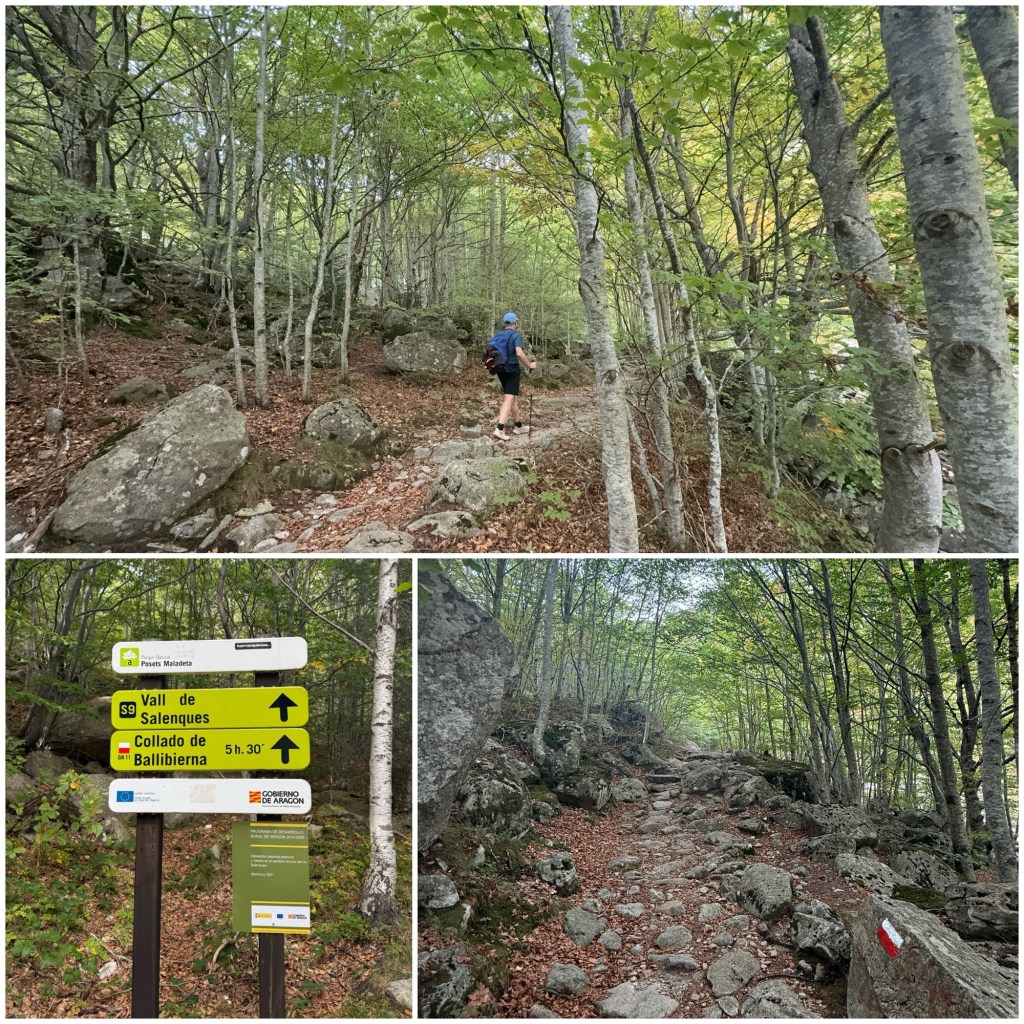 Con las dudas y la emoción de empezar, arranco en fuerte subida, ya que desde Estaon se inicia el ascenso al Coll de Lo Caubo, de 2.220 metros de altitud. Al principio el tiempo era fresco, el termómetro marcaba 4º, pero pronto entro en calor. El sendero tiene tramos empedrados, probablemente restos de algún camino tradicional, y cruza bosques y zonas de pastos.