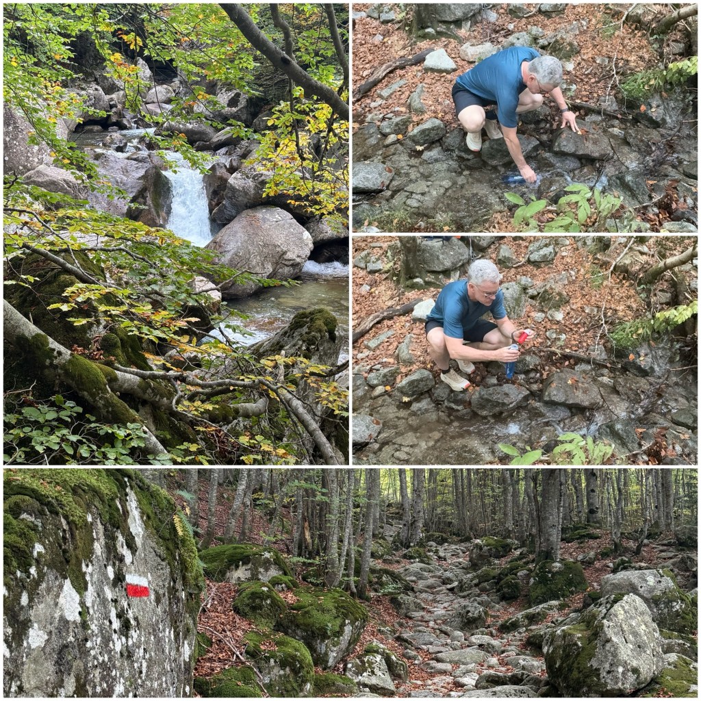 El GR11 remonta el valle de Salenques a través de un hayedo espectacular. Haber encontrado cerrado el refugio de Conangles, el único avituallamiento posible en toda la etapa, había supuesto también quedarme sin agua, así que repongo en un torrente, usando el sistema de purificación que llevo para estos casos.