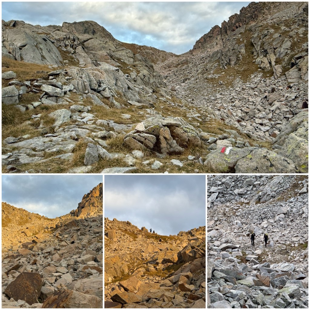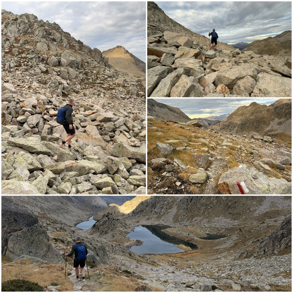 El inicio de la bajada es como el tramo final de la subida, con grandes bloques de piedra. Es el terreno habitual a esta altitud y hay que afrontarlo paso a paso y con mucho cuidado. Como también suele ser habitual, a medida que se desciende el firme mejora.