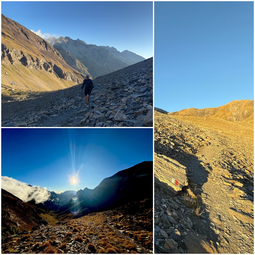 Salgo al amanecer para iniciar el ascenso a un collado… Podría ser el principio de la etapa de ayer, o de muchas otras, pero ciertamente hoy se repite, una vez más, el mismo guion. Los Pirineos son así. Aunque el de hoy es un ascenso intenso, pero breve.