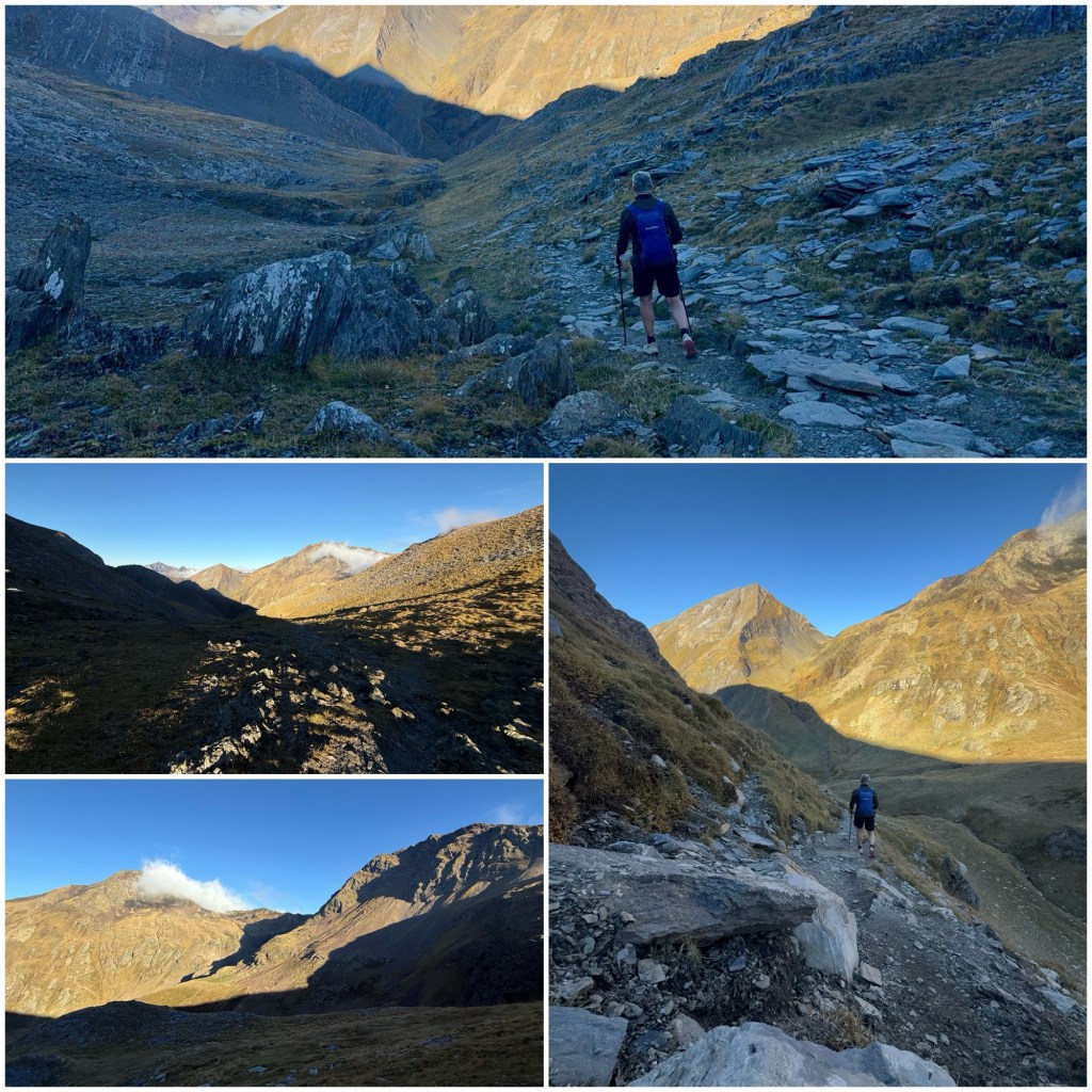 A las dos horas alcanzo el Puerto de Chistau, de 2.572 metros de altitud, mientras el viento sigue soplando fuerte. Confirmo que el terreno es muy diferente al de los días anteriores, la geología ha variado, ya no hay las rocas de granito que predominaban en otros macizos sino que aquí abundan las pizarras, y eso, curiosamente, cambia la dificultad a la hora de transitar por las aglomeraciones de piedras. Mientras pienso en esto, voy descendiendo hacia el fondo del valle.
