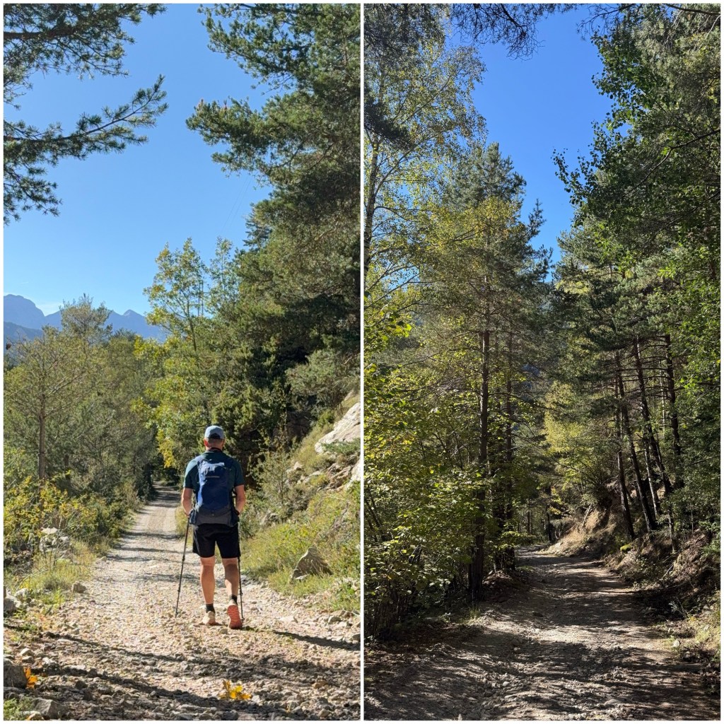 Antes de seguir pensaba parar en el refugio de Conangles a beber y comer algo, pero resulta que está cerrado. Está abierto para dormir, pero el bar no funciona durante el día fuera de los meses de verano, así que continúo tres kilómetros por una pista paralela al río Noguera Ribagorzana y a la carretera, atravesando otro bonito bosque. Es el único tramo llano en toda la etapa.
