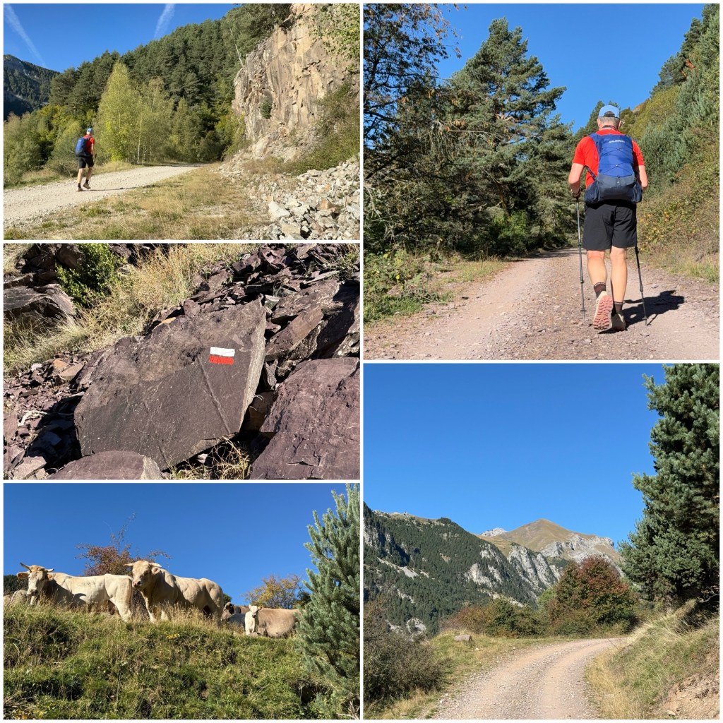 Hoy, cambio de guion. No salgo temprano, sino que más bien un poco tarde, pasadas las nueve. Porque la etapa era corta, porque he esperado a que abrieran la única cafetería del pueblo a las ocho y porque me he quedado acabando la crónica de una etapa para este blog. Cuando finalmente me pongo en marcha, subo un primer tramo por un sendero y enseguida desemboco en la carretera de Chisagüés, una aldea de 20 habitantes a un par de kilómetros de Parzán