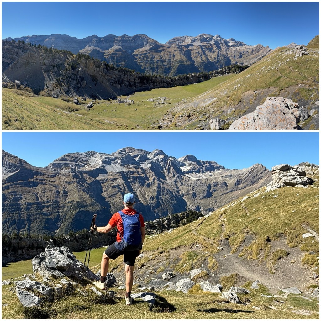 Llego al Collado de Las Coronetas, el único del día, donde coincido con tres excursionistas franceses que, como yo, están emocionados con la vista que tenemos delante. Se trata de la cara norte del Monte Perdido, el macizo calcáreo más alto de Europa y la tercera cima en altura de los Pirineos, acompañado por seis o siete tresmiles más. Desde este mirador privilegiado creo que es probablemente la vista más espectacular de toda la cordillera.