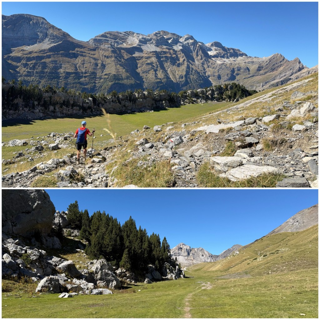 Sin dejar de admirar este skyline, absolutamente cautivador para los que amamos la montaña, empiezo a descender por un sendero entre piedras hasta un gran llano de pastos conocido como la Plana Fonda.