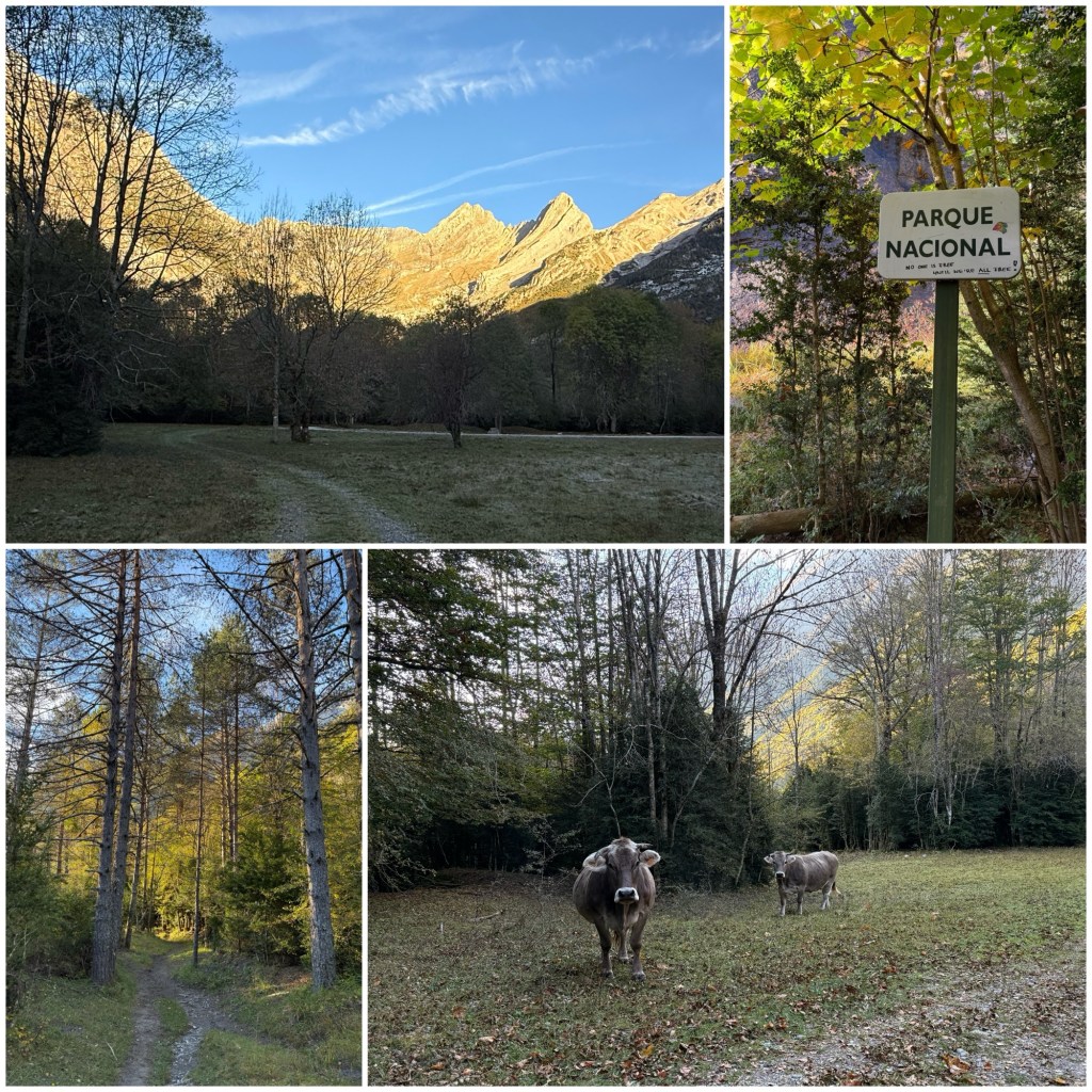 Los primeros dos kilómetros del día son plácidos, un paseo por el fondo del valle del Pineta. Los carteles confirman que he entrado en el Parque Nacional de Ordesa y Monte Perdido.