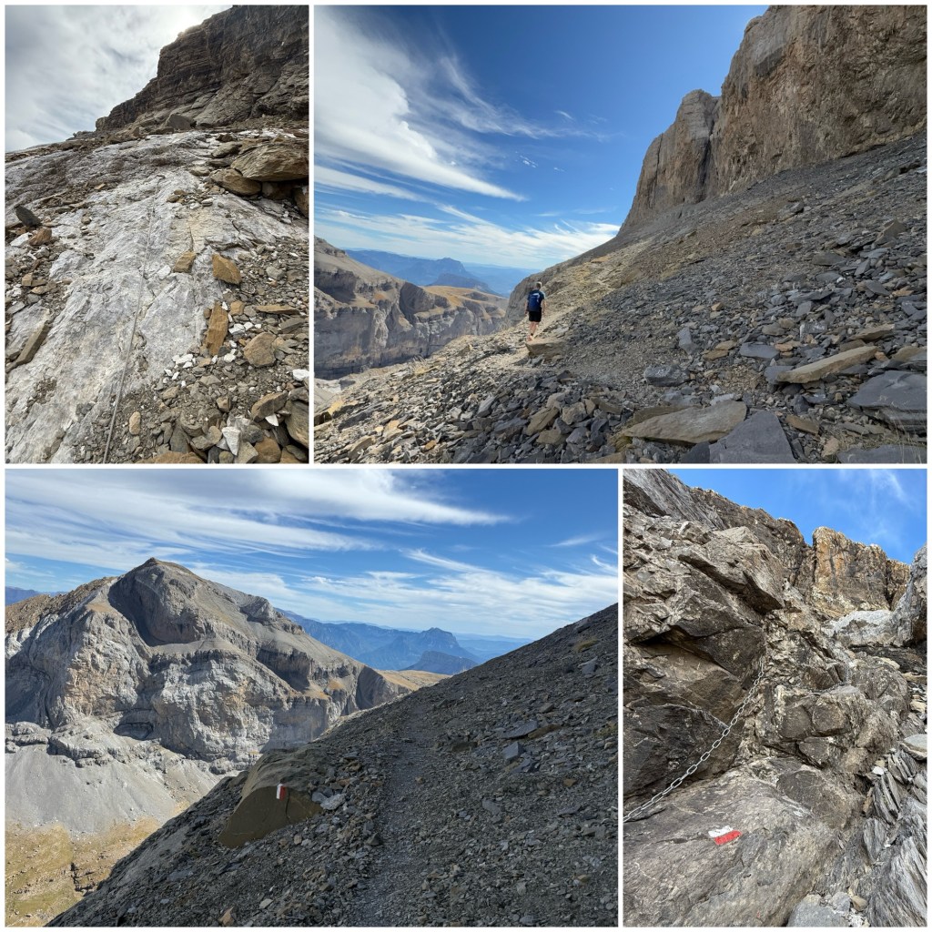 Pasado el tramo de cadenas, el sendero ya deja de subir y continúa rodeando la montaña por su ladera, sin ganar ni perder altura, siguiendo lo que es propiamente la Faja de las Olas, un término que hace referencia a una cornisa natural entre capas de roca de distinta naturaleza, de forma que hay una pequeña franja horizontal en una pared casi vertical. El paisaje es impresionante. A mis pies tengo la profunda hendidura del Cañón de Añisclo y, a lo lejos, un embalse que no sé identificar.