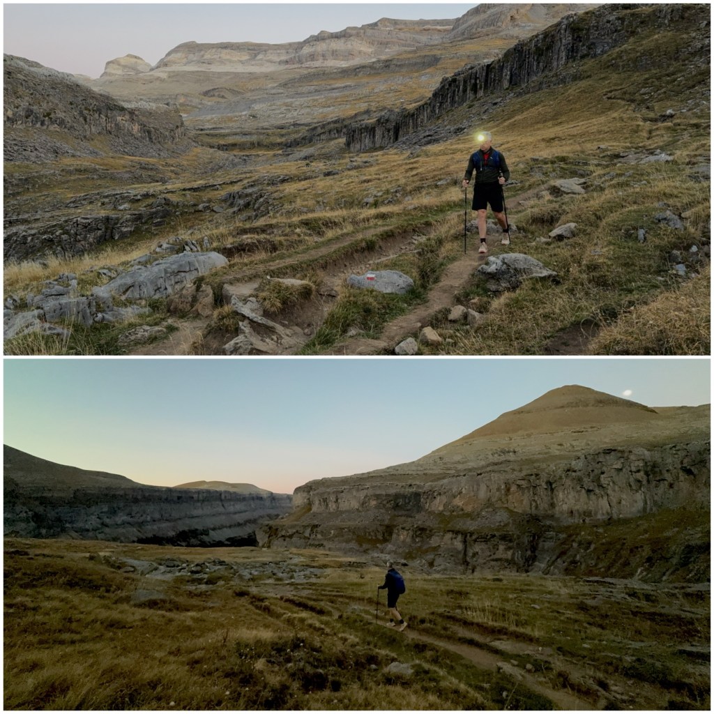 Este recorrido entre Góriz y el Valle de Ordesa, de subida o de bajada, lo he hecho varias veces en mi vida, pero hay dos que fueron tan especiales que han quedado grabadas en la memoria para siempre. Una fue un verano cuando tenía 17 o 18 años. Con dos amigos estábamos en un camping de Torla y, dejando allí las tiendas y la mayoría de material, subimos un día hasta Góriz y vivaqueamos junto al refugio, para al día siguiente ascender el Cilindro de Marboré y el Monte Perdido, dos tresmiles. Bajamos de nuevo a Góriz, descansamos y sobre las 7 o 8 de la tarde nos dio pereza pasar una segunda noche durmiendo al raso, así que decidimos descender entonces, de noche, hasta Torla. Recorrer el parque de noche fue mágico, escuchando los sonidos del bosque, alumbrados por la luz de la luna y sin gente, en un recorrido que, especialmente en verano, está siempre abarrotado de visitantes.