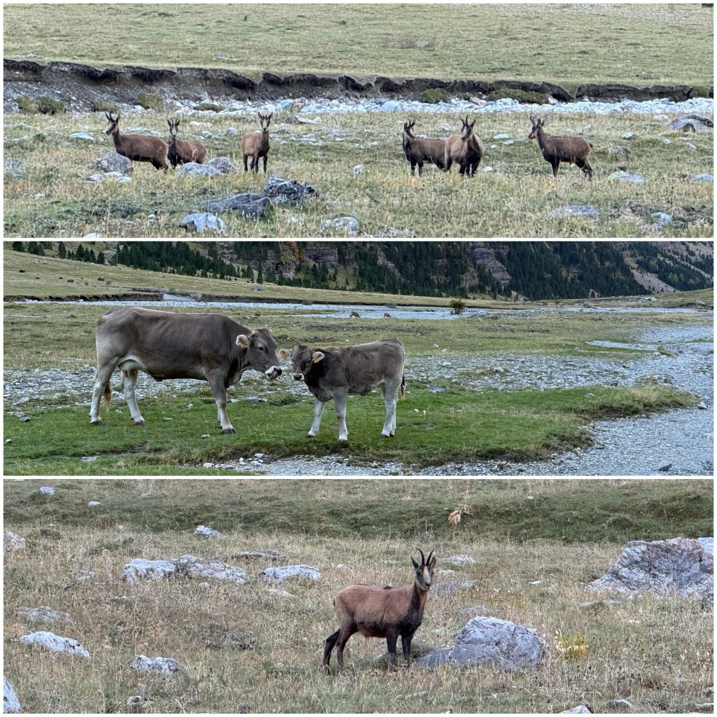 Cuando llego al fondo del valle encuentro más grupos de sarrios que corretean cerca de las vacas que pastan tranquilamente.