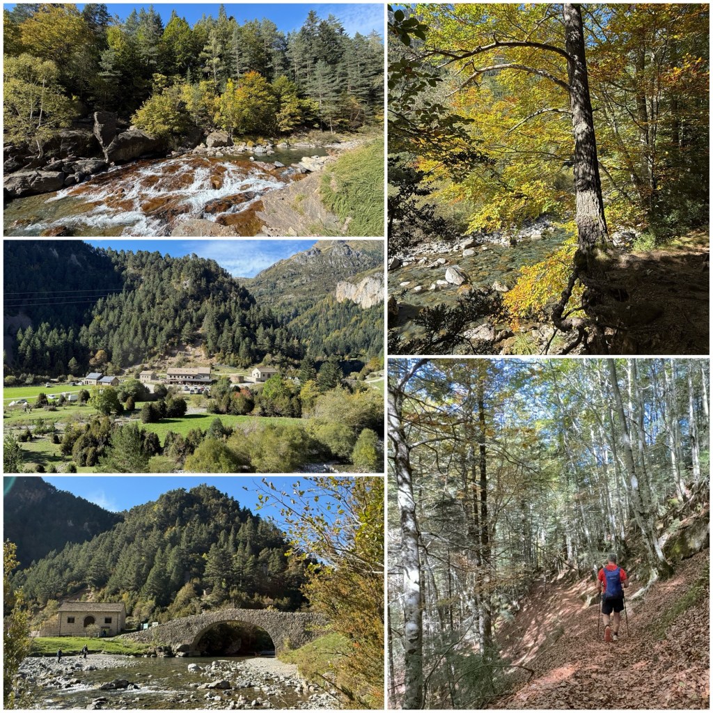Al principio se sube fuertemente a través de un pinar, pero luego la pendiente se suaviza y se avanza entre bosques por el margen izquierdo del río Ara. Es el único ascenso en una jornada en la que no hay que salvar ningún collado.