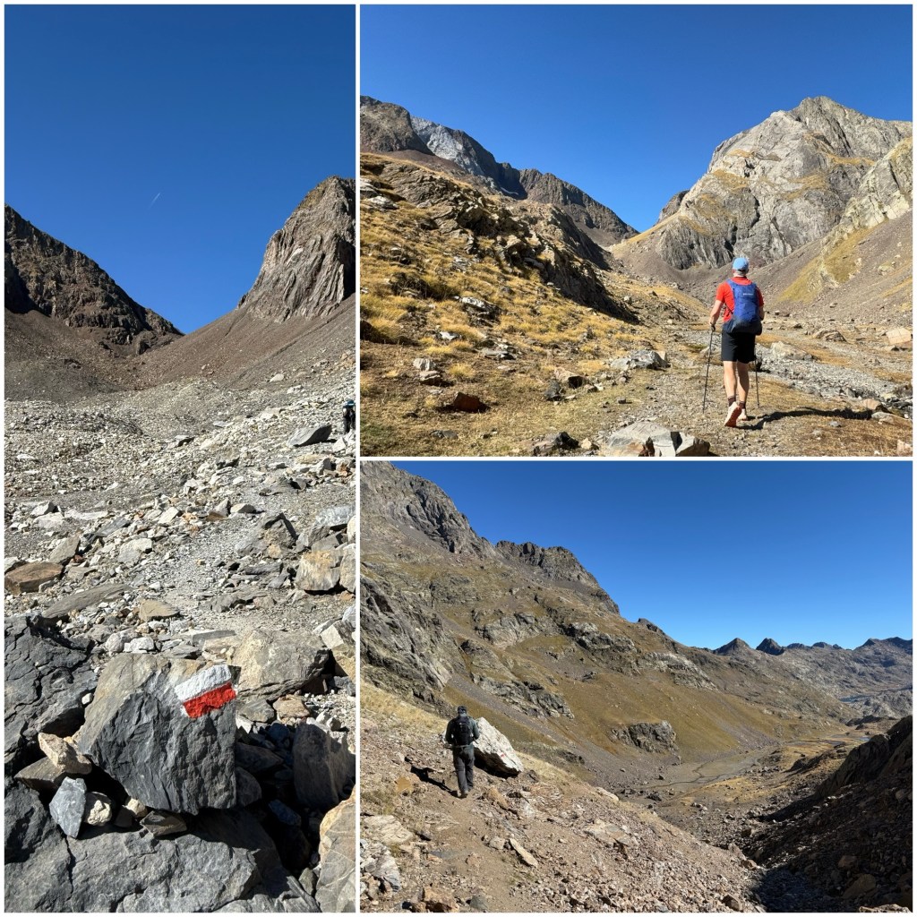 Empiezo el descenso por el valle de la Canal Roya. Al principio descendiendo bruscamente por un sendero en zigzag y, más abajo, por senderos herbosos con piedras, pero mucho más cómodos que en las zonas de alta montaña de las etapas anteriores.