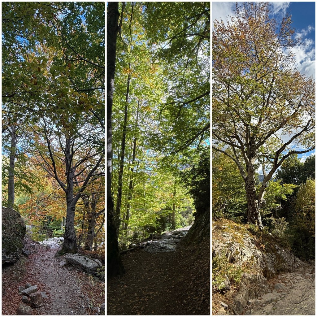 Durante los siguientes diez kilómetros el GR11 desciende el valle del Río Aguas Limpias -bonito nombre para un río- por un sendero que va colgado en la ladera de la montaña y atraviesa bosques con colores otoñales espectaculares. En algunas ocasiones parece que lo hayan cortado a pico.
