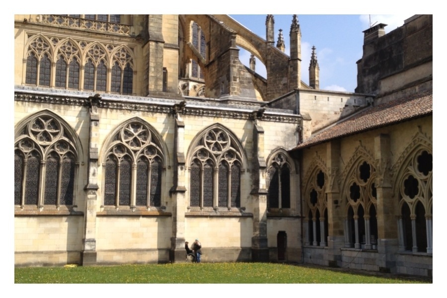 En el tren me ha llamado la atención lo bien que estaba preparado para llevar la bici, colgada como un jamón de un gancho en el techo. Este tren me ha dejado en Bayonne (o Bayona) donde tenía que esperar un par de horas en las que he comido, he dado vueltas por el centro histórico, he visto la catedral y he hecho de nuevo unos kilómetros con la bici por la ribera del río Nive.