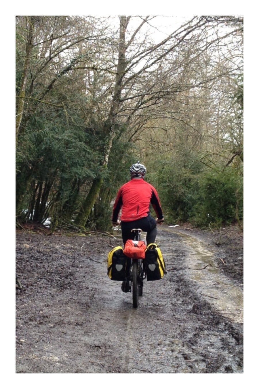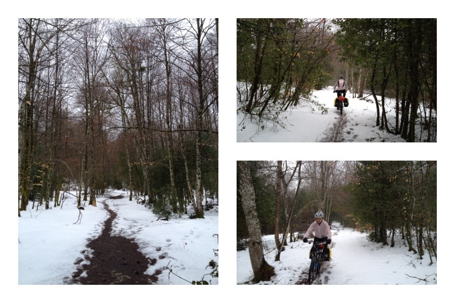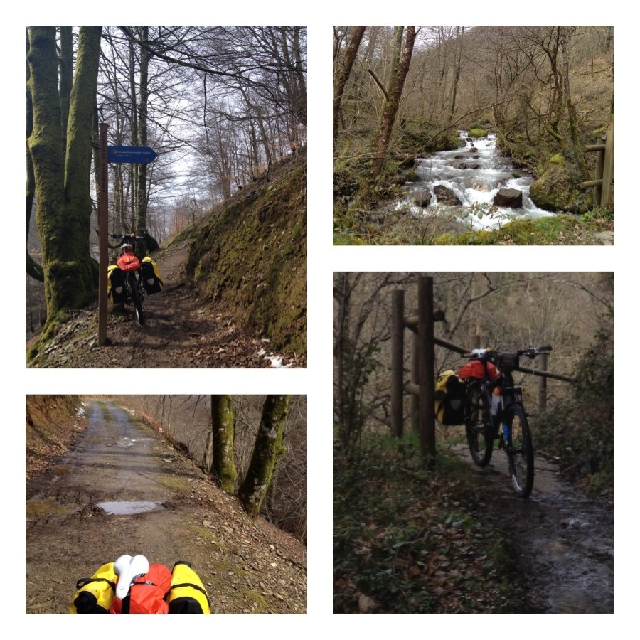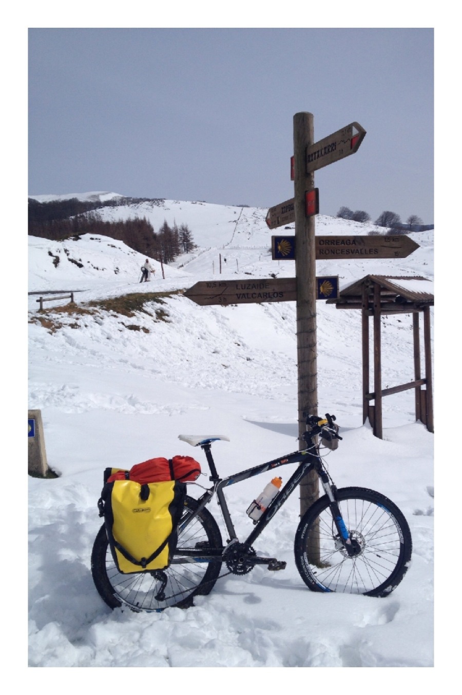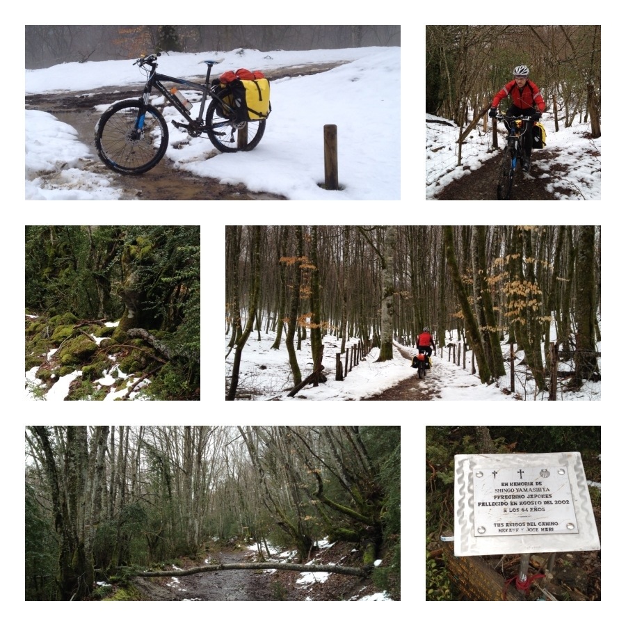 La primera mitad de la etapa de hoy ha sido espectacular. Nada mas salir de Roncesvalles se atraviesa el bosque de Sorginaritzaga o Robledal de las Brujas, siguiendo un sendero que, o bien estaba cubierto de nieve o bien la nieve se había fundido y estaba embarrado, es decir resbaladizo o resbaladizo. Con el peso de las alforjas costaba controlar la bici y he tenido un par de caídas tontas sin mayores consecuencias…