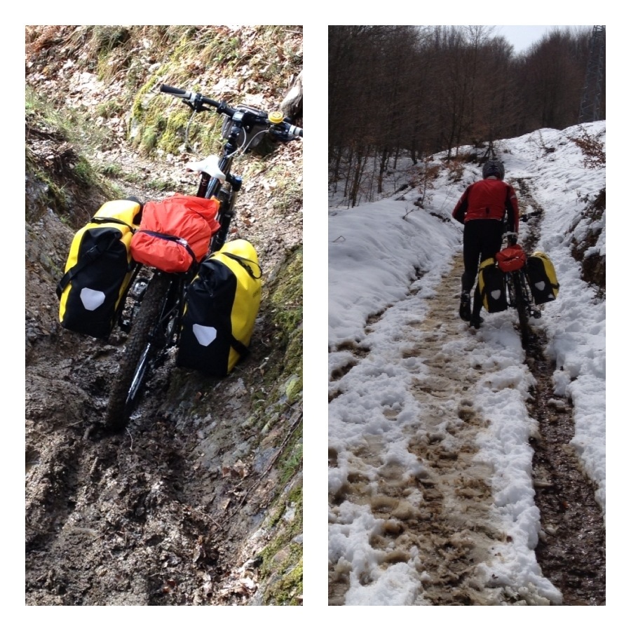 Al ir ganando altura ha empezado a aparecer la nieve. Además, al derretirse hacía que debajo estuviera todo embarrado. Algunas rampas hubieran sido matadoras sin nieve pero en estas condiciones no quedaba mas remedio que empujar. Los caminantes, que en general también iban hechos polvo, me miraban alucinados. He tenido que explicar a más de uno en inglés, francés o italiano chapurreado que «por carretera no tiene gracia y así es más divertido»