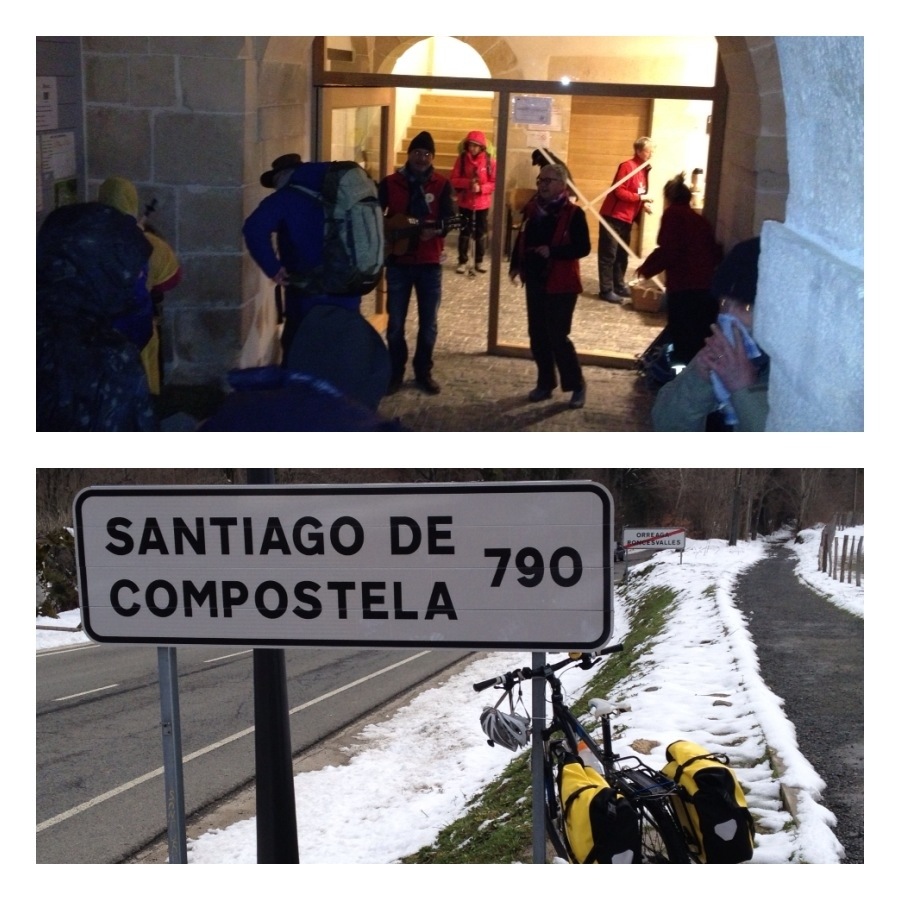 A las 7 de la mañana empieza el día con un gran «momento Camino»: los hospitaleros del Albergue de Romcesvalles despidiendo a los peregrinos a la puerta del albergue con guitarras y canciones. Después, a pocos metros de Roncesvalles, la foto de rigor junto al famoso cartel que indica la distancia a Santiago y que debe ser el indicador de carretera más fotografiado de España…