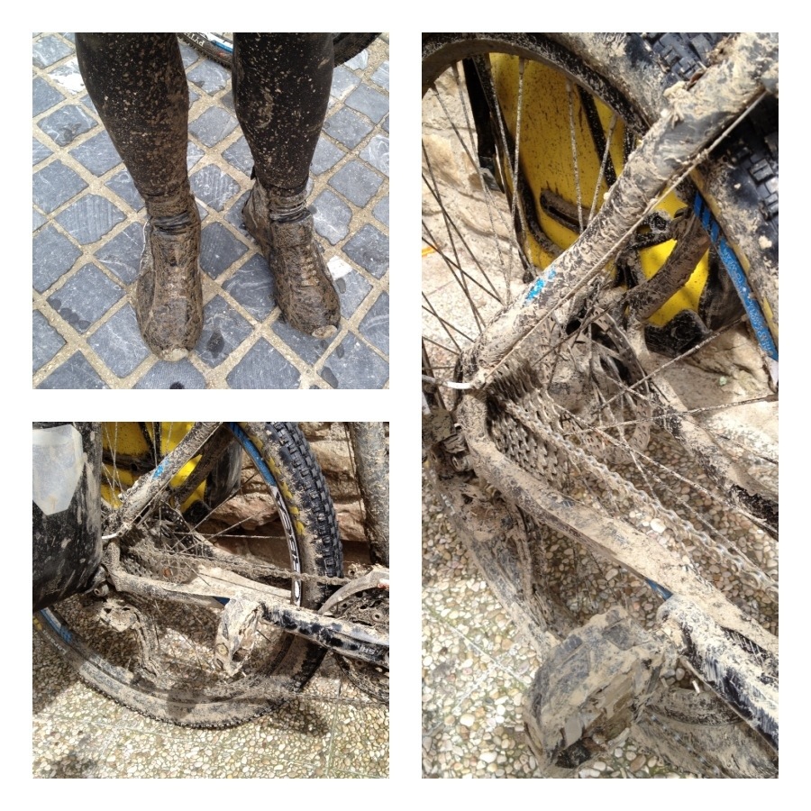 Al final del descenso la bici tenía tanto barro que no podía ni cambiar de marcha. En cuanto he visto un riachuelo junto al camino la he metido dentro para sacarle al menos lo más gordo.