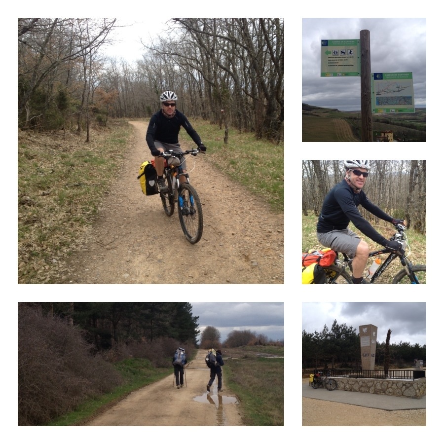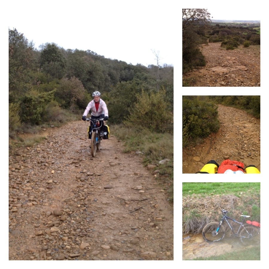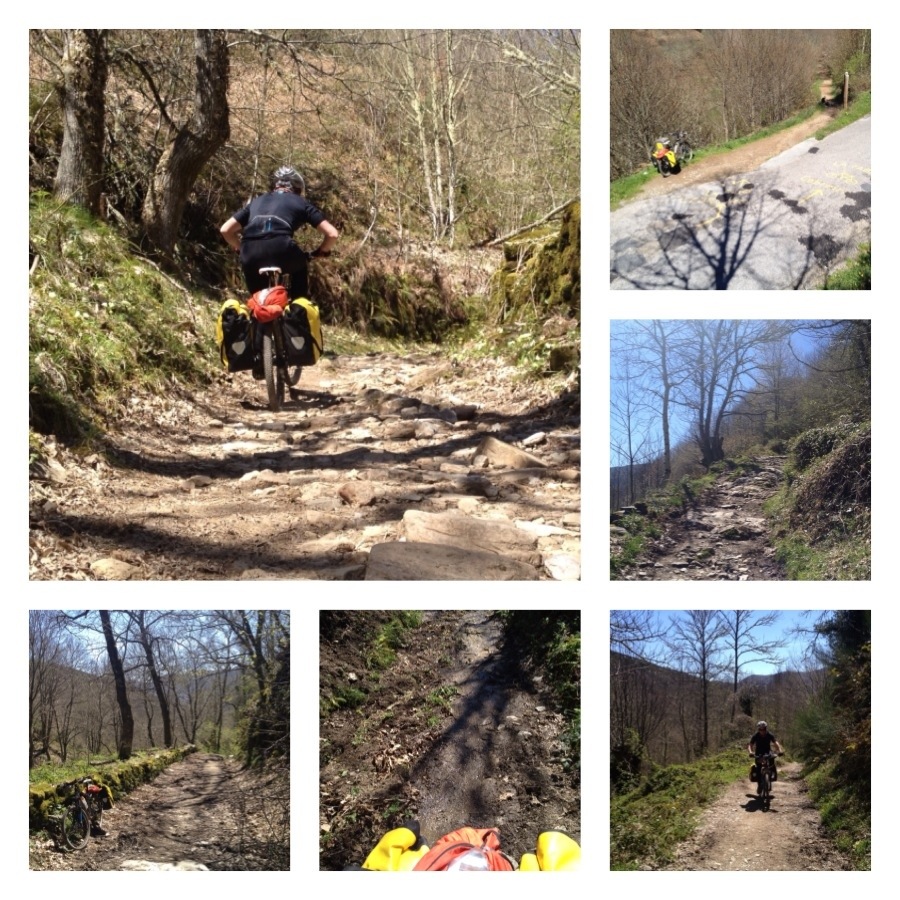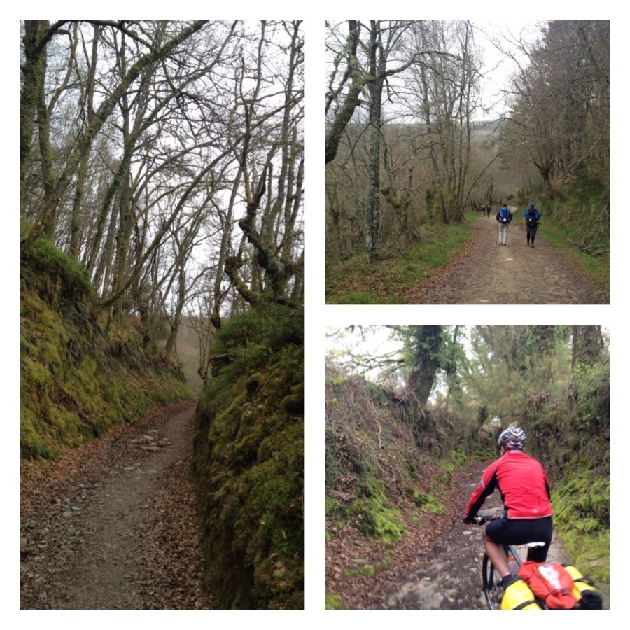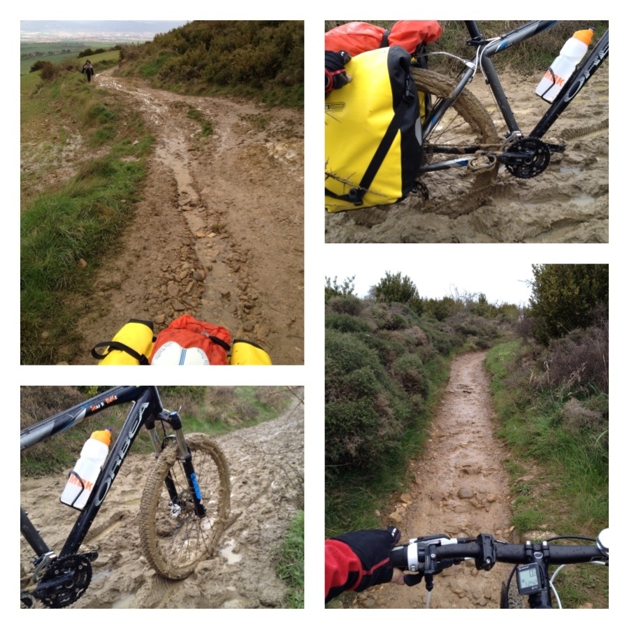 Por supuesto que he resistido y he seguido el Camino… La subida del Alto son pocos kilómetros pero demoledores: un sendero pedregoso donde a duras penas podría pedalearse en tiempo seco pero, si además le añadimos el fango acumulado, el resultado es que hay que empujar la bici cada dos por tres… Hasta los caminantes tenían problemas de «tracción» y resbalaban en algunas cuestas.