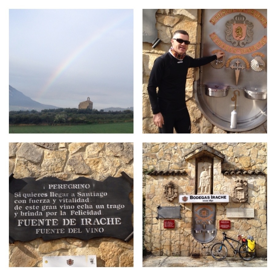 El día ha empezado bien, con buen tiempo y un arco iris enmarcando el horizonte mientras pedaleaba de Villatuerta a la cercana Estella-Lizarra. Pasada esta población se llega a uno de los lugares que aparecen en los recuerdos fotográficos de todo aquel que hace el Camino: la fuente del vino. Se trata de una fuente en el exterior de las bodegas Irache de las que, efectivamente, mana vino o agua a voluntad. Aunque, ¿quien bebe vino a primera hora de la mañana con todo el día de pedaleo por delante? Yo me he hecho la foto pero realmente ni lo he probado…