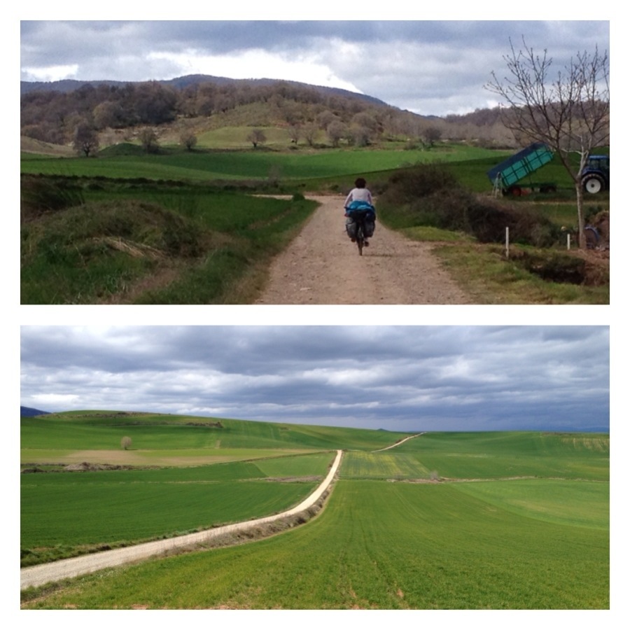 Todos los que salimos de Pamplona vamos pensando en la subida al Alto del Perdón, a solo 15 km y distinguible desde muy lejos por la fila de aerogeneradores que tiene en la cima. Cerca del último pueblo antes del inicio de la ascensión, Zariquiegi, he pinchado. Mientras arreglaba el pinchazo ha pasado un señor de pueblo y me ha dicho: «Que mala suerte. Claro, es que con la bici no se puede subir por aquí. Al llegar al pueblo tira a la derecha y encontrarás la carretera que te sube directamente al Perdón. Por el Camino no se puede subir». Al cabo de dos minutos ha pasado otro señor y me ha dicho… exactamente lo mismo. ¡La presión psicológica sobre los que queremos hacer el Camino en bici siguiendo estrictamente las flechas amarillas es brutal!