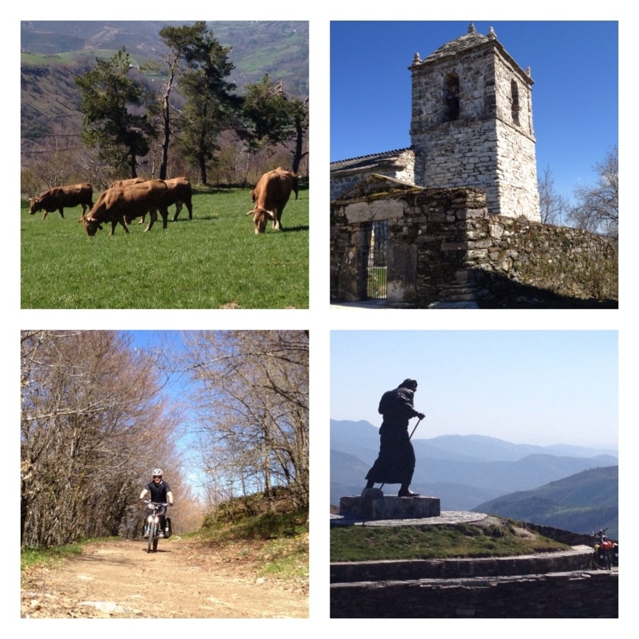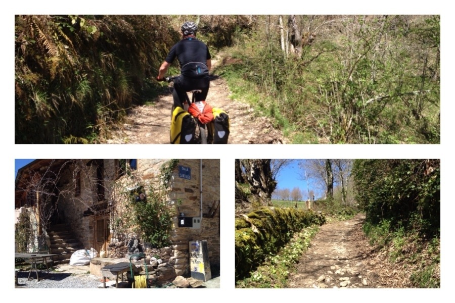 Después de Villafranca, se sigue igual otros 20 km por carreteras locales, pistas y andaderos paralelos a la nacional VI pero, a diferencia de los anteriores, ahora son en ascenso continuo, aunque suave. Pasado el pueblo de Las Herrerías la pendiente aumenta considerablemente y, un kilómetro después, hay el cruce que indica la variante para bicis por la derecha o el sendero para caminantes por la izquierda. Llevaba días dudando cual tomar. En este caso las dos opciones son duras. La de bicicletas es una carretera local con pendientes fuertísimas que muchos han de superar empujando. La del sendero por la montaña tiene tramos pedregosos, restos de una antigua calzada romana que difícilmente son ciclables, y aún menos con la bicicleta cargada. En foros había leído que incluso algunas personas que habitualmente aconsejan seguir siempre la ruta de los peregrinos a pie aquí recomiendan la variante de bicicletas. pero también había leído a otros que la habían hecho y la recomendaban, aún asumiendo que hay que empujar la bici en algunos tramos. Yo sabía que si no lo intentaba me quedaría con las ganas así que he decidido subir por el sendero. Y realmente ha sido duro, aunque el paisaje compensaba con creces el esfuerzo. Hasta el pueblo de La Faba solo hay 1,5 km pero creo que casi la mitad la he tenido que hacer empujando. Son piedras enormes, con tramos de pendiente muy fuerte e incluso algunos escalones en la roca así que es muy difícil progresar sin poner pie a tierra…