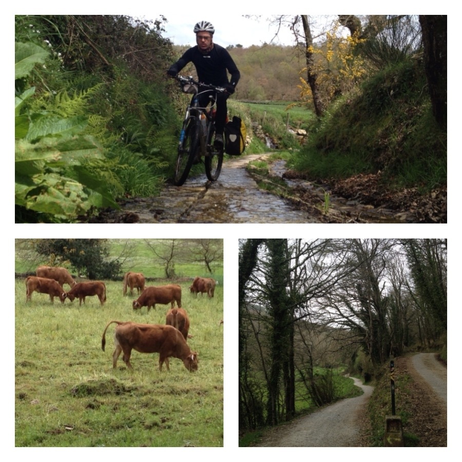 Al principio, todo perfecto. He dejado atrás SJPP medio envuelto en la niebla y he empezado a subir, primero por carretera y pronto por otras carreteritas secundarias y pistas sin asfaltar entre granjas, prados y bosques. El paisaje era precioso, constantemente adelantaba peregrinos a píe a los que saludaba con el ritual «buen camino», ha salido un sol radiante después de semanas de llover prácticamente cada día y yo estaba tan contento que iba cantando en voz alta a todo pulmón…