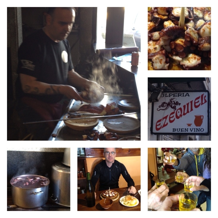 Y así he llegado a Melide. Si hay un lugar mítico en el Camino Francés, casi tanto como la Cruz de Ferro o la subida al Cebreiro, ese es la Pulpería Ezequiel de Melide. Aparece recomendada en todas las guías y foros y más de uno organiza las etapas de forma que le coincida dormir en Melide con tal de poder cenar en Ezequiel. En mi caso he parado a comer. Una pulpería de las de siempre, con mesas largas para compartir y bancos de madera. He preguntado al cocinero (no sé si era el tal Ezequiel) cuantos kilos de pulpo servían al día. Como buen gallego me ha respondido «depende» (perdonadme mis amigos gallegos por recurrir al tópico pero lo cuento tal como ha sido). Después se ha explicado mejor y me ha dicho que unos 200 kg en días normales, 19.000 kilos en todo el año 2012… Es muuuuucho pulpo… Yo he comido pulpo a feira, cachelos y un pan gallego brutal. Todo regado con ribeiro de la casa servido en los tradicionales cuencos de barro. De postre tarta de Santiago y café de puchero. Más gallego imposible. Solo faltaban las gaitas y ponerme a bailar una muñeira… Y para rematar, un orujo de hierbas con el que he brindado con los compañeros de mesa, tres peregrinos catalanes y dos mejicanos. Una comida para aplaudir.